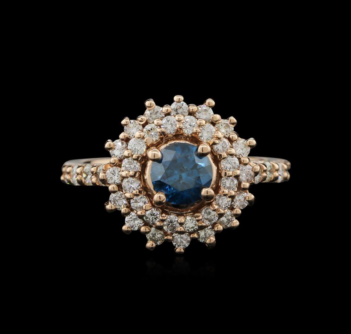 One electronically tested 14KT rose gold lady's cast halo ring with a basket setting with a bright polish finish. The featured ladies ring has a 2.00mm shank. Identified with markings of "K14". Condition is new, good workmanship. Containing: One prong set round brilliant cut diamond, measuring 5.60 - 5.55 x 3.91mm (depth est.) approximate weight of 0.72ct. Colored gemstones are presumed to have been subjected to commonly used enhancement processes. Graded in the setting. Clarity: I-1 Cut Good Thirty-Two prong set round brilliant cut diamonds, measuring 1.70 - 1.60 x 1.07mm (depth est.) approximate. Total Weight of 32 Stones = 0.59ct. Graded in the setting. Clarity: SI-1 to I-1. Color: H - Good Eight prong set round brilliant cut diamonds, measuring 2.00 - 1.95 x 1.29mm (depth est.) approximate. Total Weight of 8 Stones = 0.25ct. Graded in the setting. Clarity: SI-1 to SI-2. Color: H - Good. Total Weight of Diamonds 1.56ct. Total Weight of Ring 4.90gm. GAS Appraised at $5,440.00.