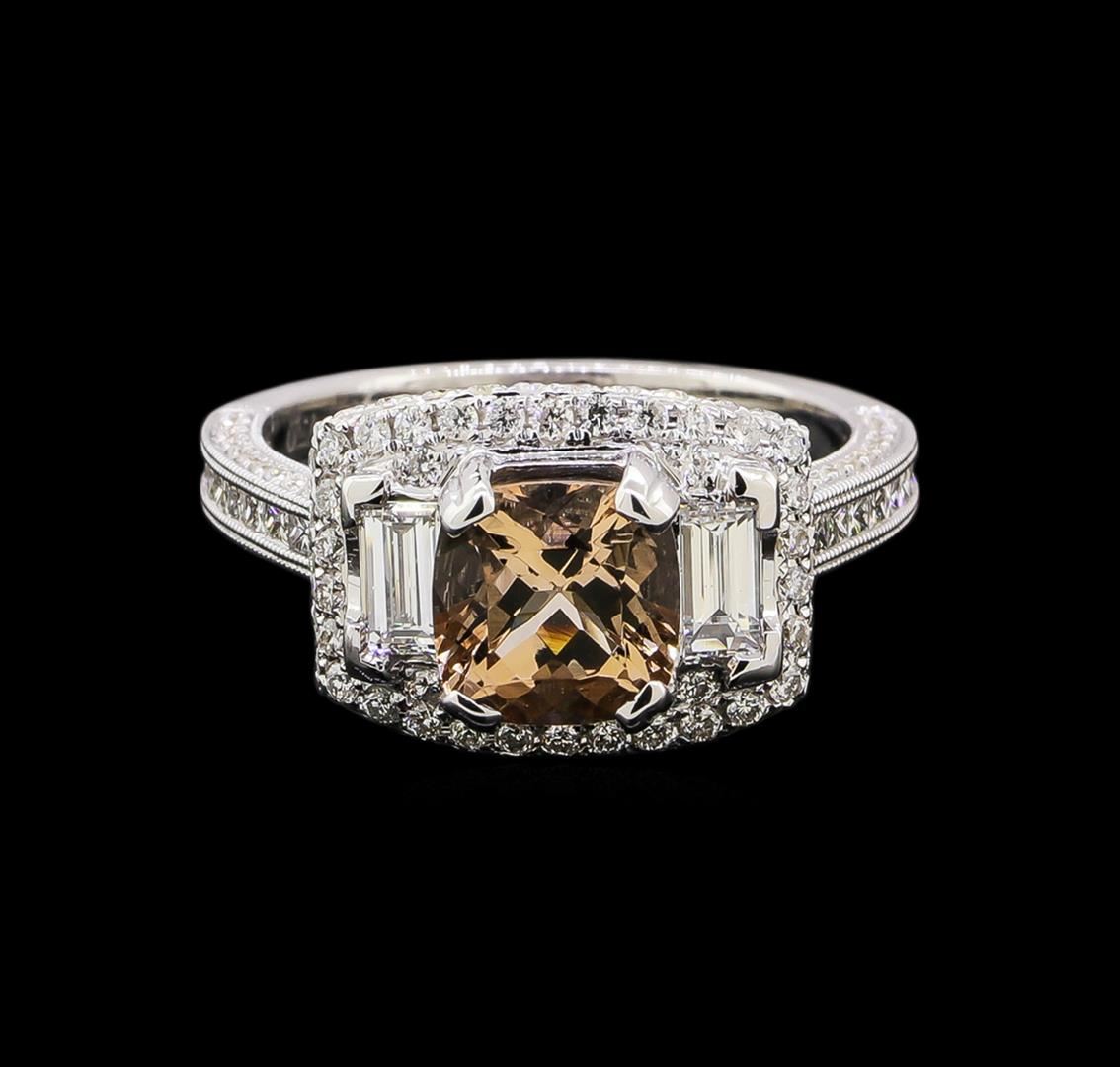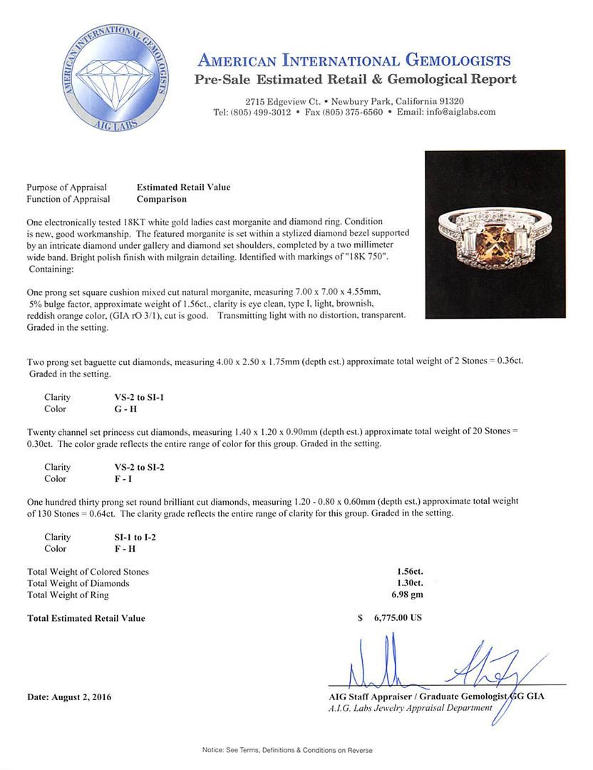 One electronically tested 18KT white gold ladies cast morganite and diamond ring. The featured morganite is set within a stylized diamond bezel supported by an intricate diamond under gallery and diamond set shoulders, completed by a two millimeter wide band. Bright polish finish with milgrain detailing. Identified with markings of '18K 750'. Condition is new, good workmanship. Containing: One prong set square cushion mixed cut natural morganite, measuring 7.00 x 7.00 x 4.55mm, 5%. bulge factor, approximate weight of 1.56ct., clarity is eye clean, type I, light, brownish, reddish orange color, (GIA rO 3/1), cut is good. Transmitting light with no distortion, transparent. Graded in the setting. Two prong set baguette cut diamonds, measuring 4.00 x 2.50 x 1.75mm (depth est.) approximate total weight of 2 Stones = 0.36ct. Graded in the setting. Clarity VS-2 to SI-1. Color: G - H Twenty channel set princess cut diamonds, measuring 1.40 x 1.20 x 0.90mm (depth est.) approximate total weight of 20 Stones = 0.30ct. The color grade reflects the entire range of color for this group. Graded in the setting. Clarity VS-2 to SI-2. Color: F - I One Hundred Thirty prong set round brilliant cut diamonds, measuring 1.20 - 0.80 x 0.60mm (depth est.) approximate total weight of 130 Stones = 0.64ct. The clarity grade reflects the entire range of clarity for this group. Graded in the setting. Clarity SI-1 to I-2. Color: F - H. Total Weight of Colored Stones 1.56ct.. Total Weight of Diamonds 1.30ct.. Total Weight of Ring 6.98gm. AIG Appraised at $6,775.00.