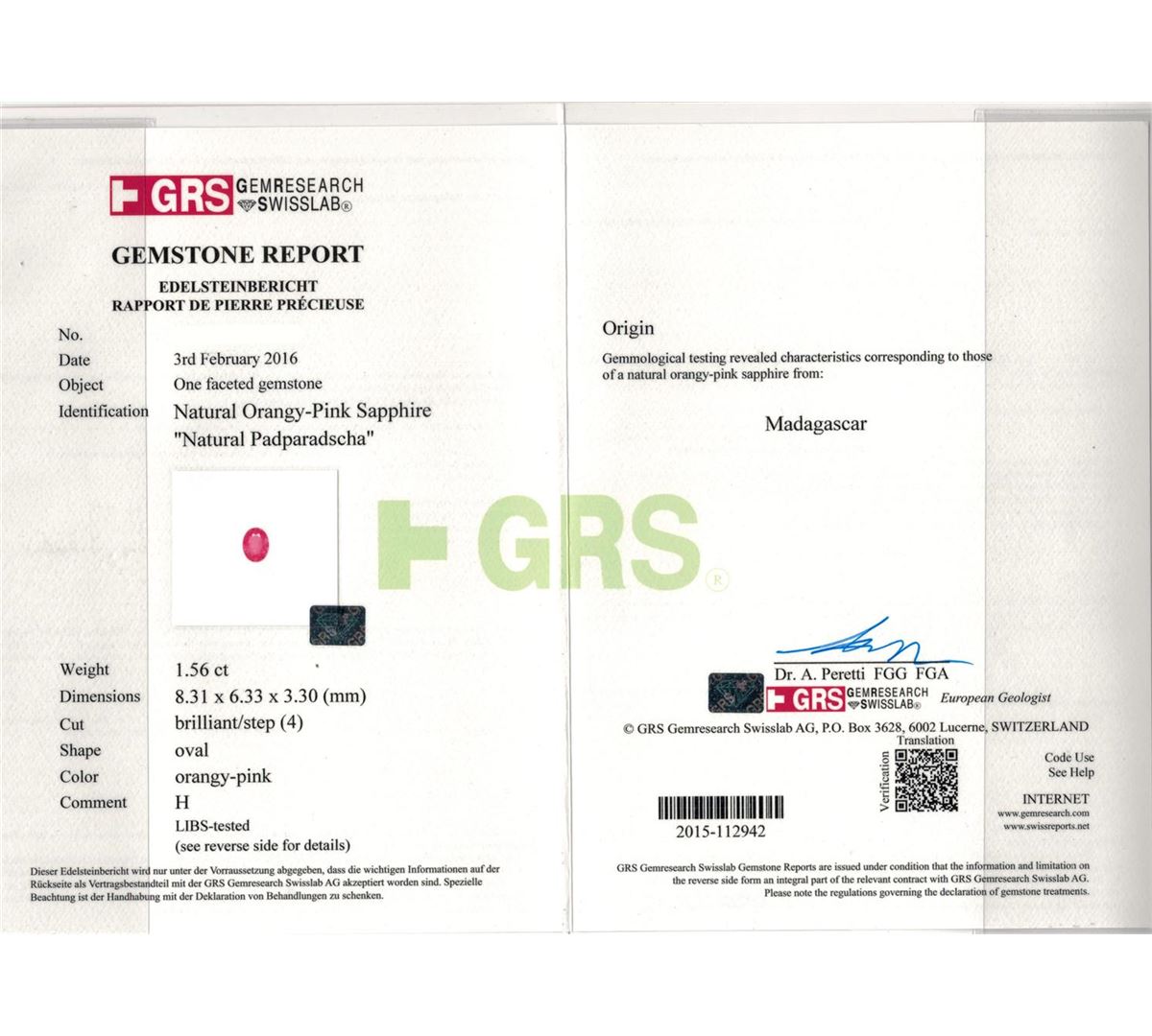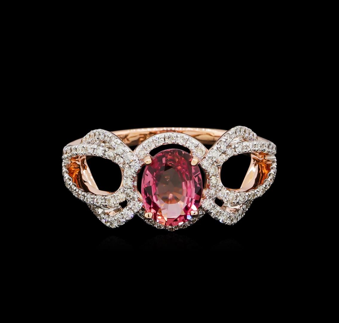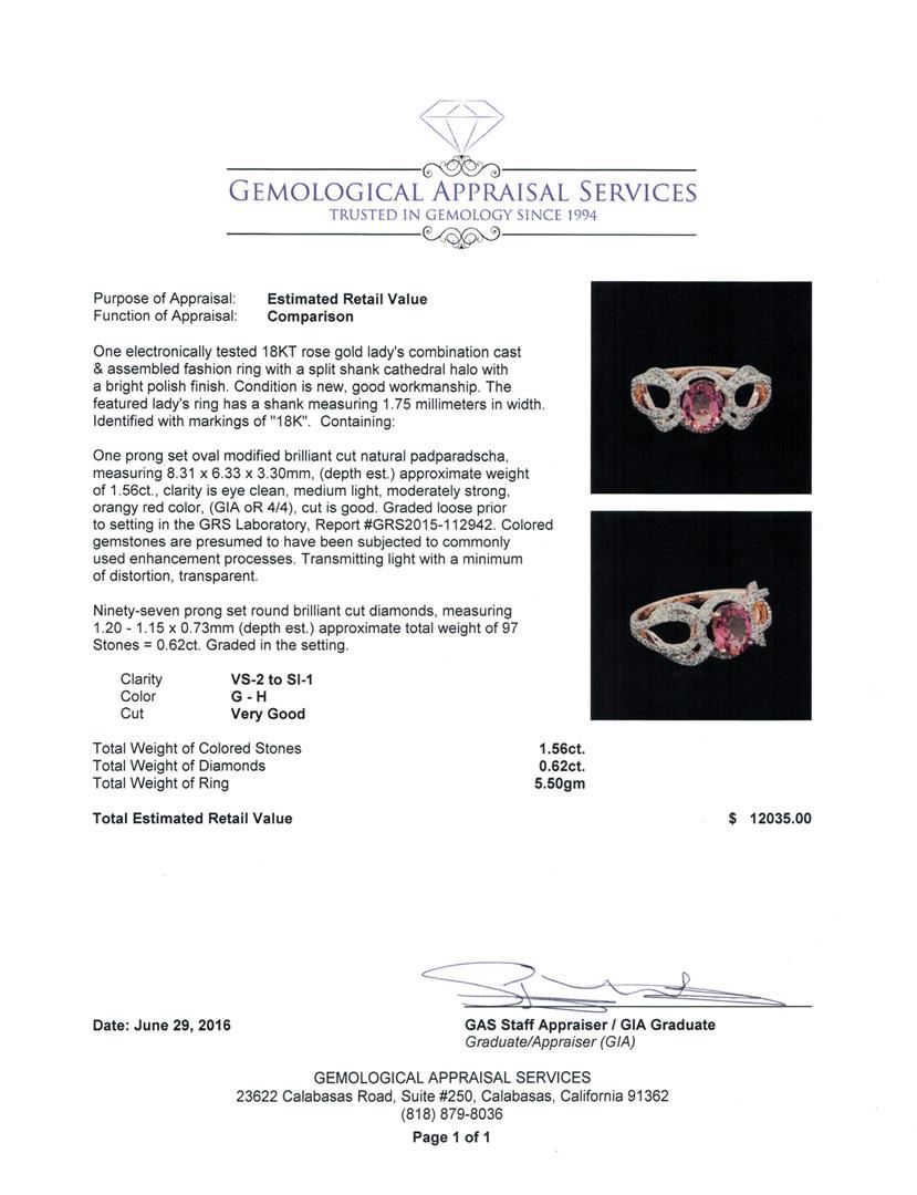 One electronically tested 18KT rose gold lady's combination cast & assembled fashion ring with a split shank cathedral halo with a bright polish finish. The featured lady's ring has a shank measuring 1.75 millimeters in width. Identified with markings of "18K". Condition is new, good workmanship. Containing: One prong set oval modified brilliant cut natural padparadscha, measuring 8.31 x 6.33 x 3.30mm, (depth est.) approximate weight of 1.56ct., clarity is eye clean, medium light, moderately strong, orangy red color, (GIA oR 4/4), cut is good. Graded loose prior to setting in the GRS Laboratory, Report #GRS2015-112942. Colored gemstones are presumed to have been subjected to commonly used enhancement processes. Transmitting light with a minimum of distortion, transparent. Ninety-Seven prong set round brilliant cut diamonds, measuring 1.20 - 1.15 x 0.73mm (depth est.) approximate total weight of 97 Stones = 0.62ct. Graded in the setting. Clarity: VS-2 to SI-1. Color: G - Very Good. Total Weight of Colored Stones 1.56ct. Total Weight of Diamonds 0.62ct. Total Weight of Ring 5.50gm. GAS Appraised at $12,035.00.