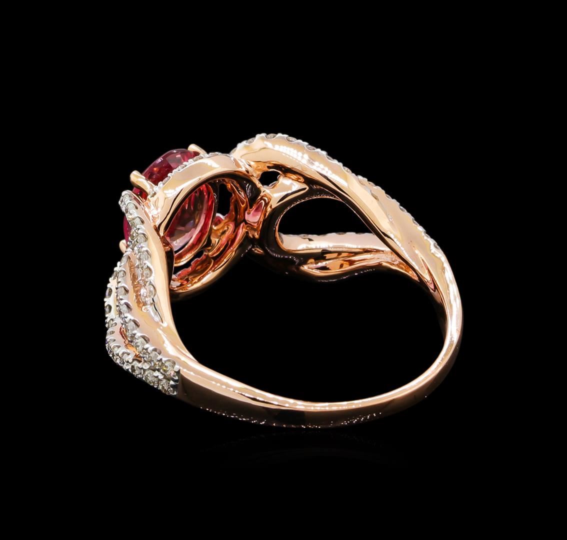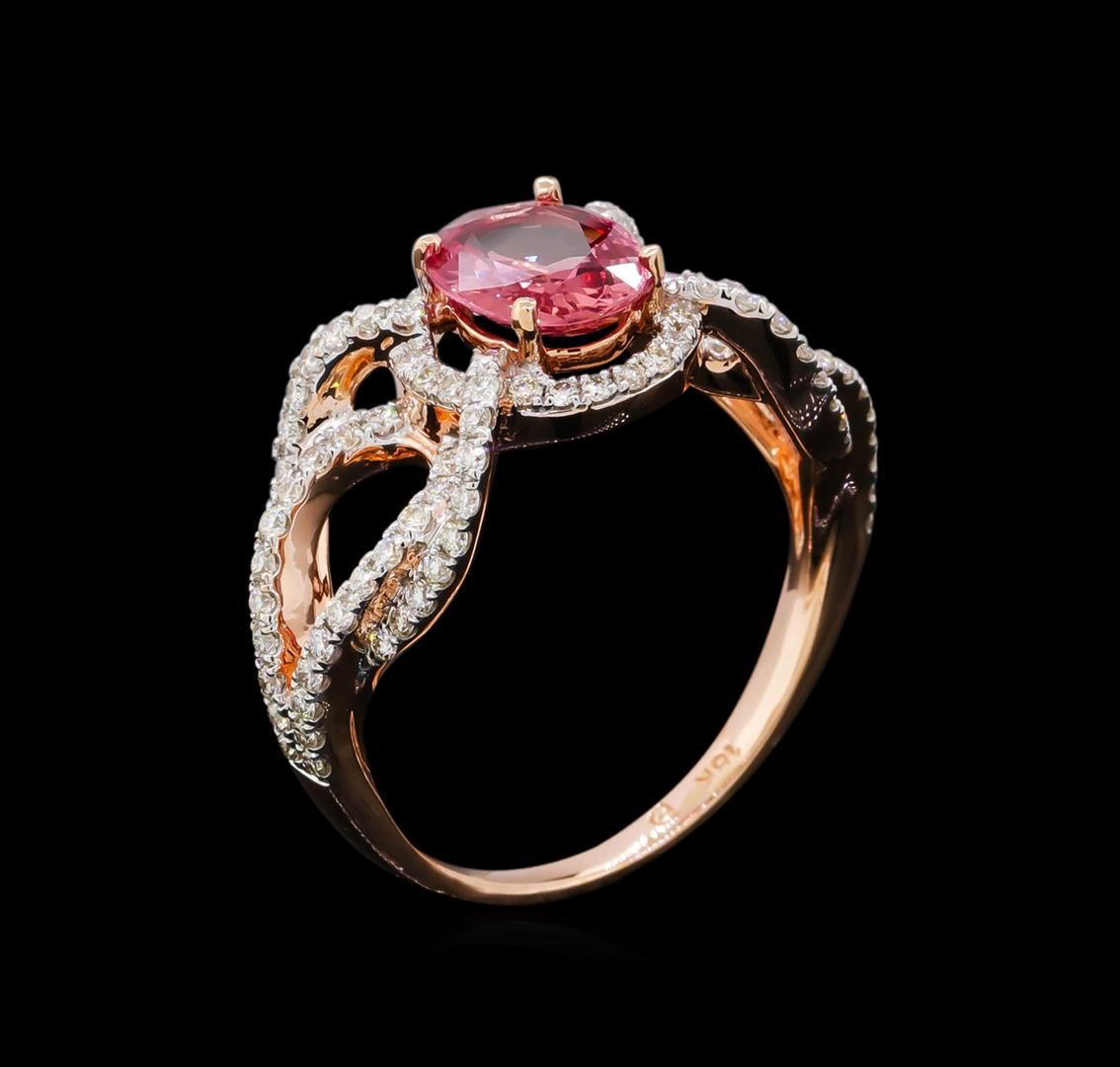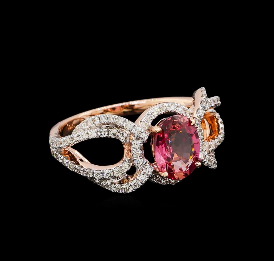 One electronically tested 18KT rose gold lady's combination cast & assembled fashion ring with a split shank cathedral halo with a bright polish finish. The featured lady's ring has a shank measuring 1.75 millimeters in width. Identified with markings of "18K". Condition is new, good workmanship. Containing: One prong set oval modified brilliant cut natural padparadscha, measuring 8.31 x 6.33 x 3.30mm, (depth est.) approximate weight of 1.56ct., clarity is eye clean, medium light, moderately strong, orangy red color, (GIA oR 4/4), cut is good. Graded loose prior to setting in the GRS Laboratory, Report #GRS2015-112942. Colored gemstones are presumed to have been subjected to commonly used enhancement processes. Transmitting light with a minimum of distortion, transparent. Ninety-Seven prong set round brilliant cut diamonds, measuring 1.20 - 1.15 x 0.73mm (depth est.) approximate total weight of 97 Stones = 0.62ct. Graded in the setting. Clarity: VS-2 to SI-1. Color: G - Very Good. Total Weight of Colored Stones 1.56ct. Total Weight of Diamonds 0.62ct. Total Weight of Ring 5.50gm. GAS Appraised at $12,035.00.