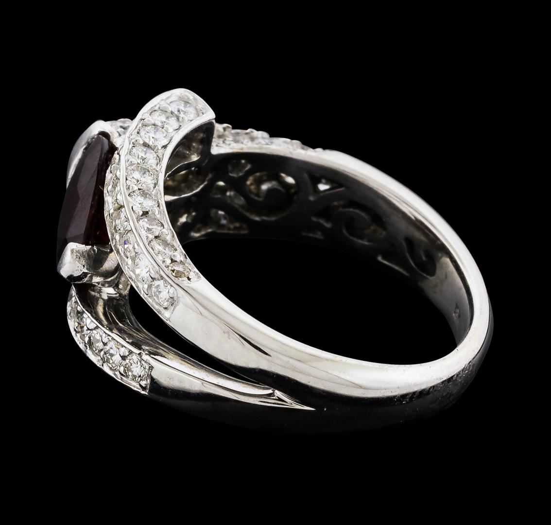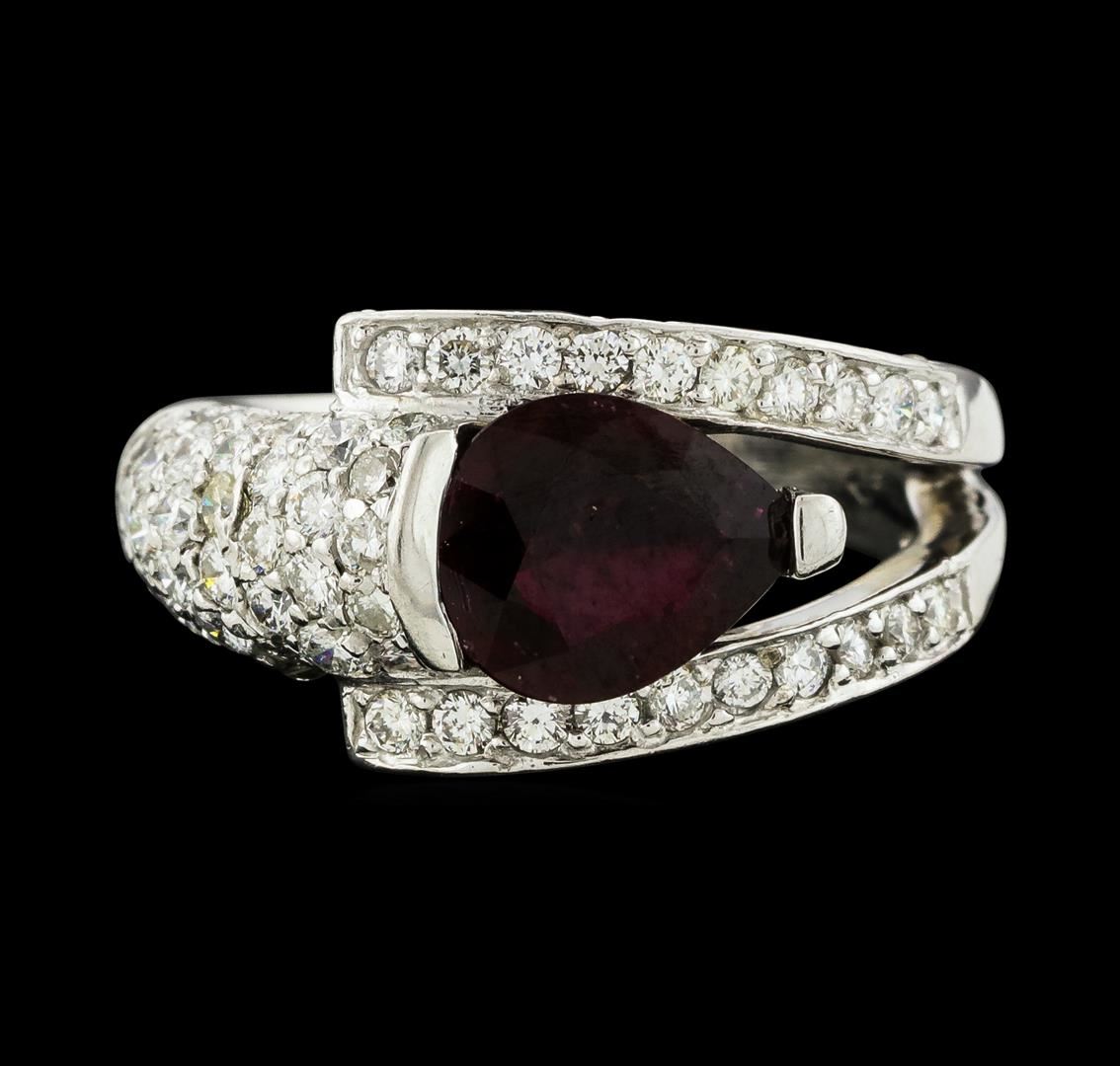 One electronically tested 18KT white gold lady's cast fashion ring with a split shank with a bright polish finish. The featured lady's ring has a shank measuring 2.92 millimeters wide. Identified with markings of '18K'. Condition is new, good workmanship. Containing: One prong set pear modified brilliant cut natural ruby, measuring 9.05 x 7.20 x 3.03mm, (depth est.) approximate weight of 1.56ct., clarity is heavily included, dark, strong, red color, (GIA R 7/5), cut is good. Transmitting light somewhat diffusely, semi-transparent to translucent. Naturally occurring internal & external characteristics are present. Indications of laboratory high temperature heat treatment, with glass & flux additives. Colored gemstones are presumed to have been subjected to commonly used enhancement processes. Graded in the setting. Thirty-Seven prong set round brilliant cut diamonds, measuring 1.90 - 1.75 x 1.13mm (depth est.) approximate total weight of 37 Stones = 0.85ct. Graded in the setting. Clarity VS-2 to SI-1. Color: H - I Cut Good Thirty-Eight prong set round brilliant cut diamonds, measuring 1.70 - 1.50 x 0.99mm (depth est.) approximate total weight of 38 Stones = 0.60ct. Graded in the setting. Clarity VS-2 to SI-1. Color: H - I Cut Good. Total Weight of Colored Stones 1.56ct.. Total Weight of Diamonds 1.45ct.. Total Weight of Ring 6.70gm. GAS Appraised at $5,765.00.