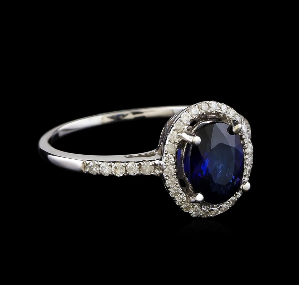One electronically tested 14KT white gold ladies cast sapphire and diamond ring with a bright polish finish. The featured sapphire is set within a diamond bezel supported by diamond set shoulders, completed by a one millimeter wide band. Trademark is Orianne. Identified with markings of "14K". Condition is new, good workmanship. Containing: One prong set oval mixed cut natural blue sapphire, measuring 8.02 x 6.10 x 2.74mm, 12%. bulge factor, approximate weight of 1.56ct., clarity is slightly included, type II, dark, very slightly grayish, blue color, (GIA B 7/3), cut is good. Transmitting light with a minimum of distortion, transparent. Naturally occurring internal & external characteristics are present. Indications of laboratory high temperature diffusion treatment. Graded in the setting. Thirty-Eight prong set round brilliant cut diamonds approximate total weight of 38 Stones = 0.26ct. Graded in the setting. Clarity: I-2 to I-3. Color: H - I. Total Weight of Colored Stones 1.56ct. Total Weight of Diamonds 0.26ct. Total Weight of Ring 2.91gm. AIG Appraised at $1,680.00.