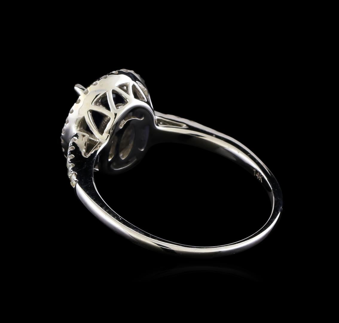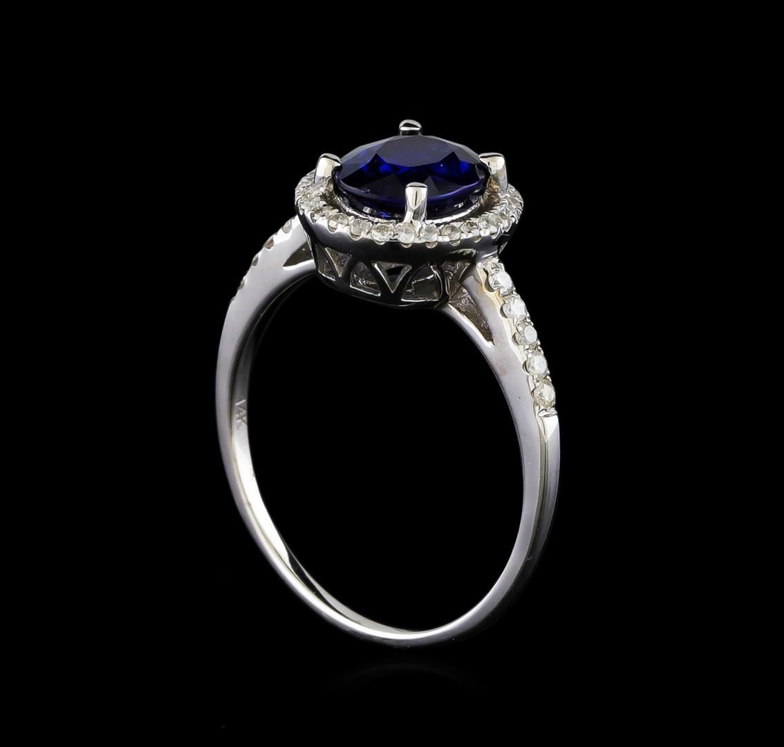 One electronically tested 14KT white gold ladies cast sapphire and diamond ring with a bright polish finish. The featured sapphire is set within a diamond bezel supported by diamond set shoulders, completed by a one millimeter wide band. Trademark is Orianne. Identified with markings of "14K". Condition is new, good workmanship. Containing: One prong set oval mixed cut natural blue sapphire, measuring 8.02 x 6.10 x 2.74mm, 12%. bulge factor, approximate weight of 1.56ct., clarity is slightly included, type II, dark, very slightly grayish, blue color, (GIA B 7/3), cut is good. Transmitting light with a minimum of distortion, transparent. Naturally occurring internal & external characteristics are present. Indications of laboratory high temperature diffusion treatment. Graded in the setting. Thirty-Eight prong set round brilliant cut diamonds approximate total weight of 38 Stones = 0.26ct. Graded in the setting. Clarity: I-2 to I-3. Color: H - I. Total Weight of Colored Stones 1.56ct. Total Weight of Diamonds 0.26ct. Total Weight of Ring 2.91gm. AIG Appraised at $1,680.00.