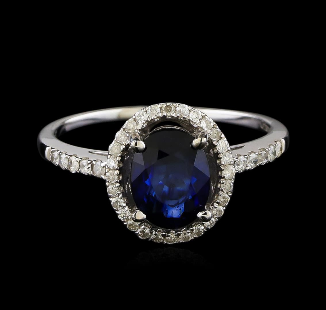 One electronically tested 14KT white gold ladies cast sapphire and diamond ring with a bright polish finish. The featured sapphire is set within a diamond bezel supported by diamond set shoulders, completed by a one millimeter wide band. Trademark is Orianne. Identified with markings of "14K". Condition is new, good workmanship. Containing: One prong set oval mixed cut natural blue sapphire, measuring 8.02 x 6.10 x 2.74mm, 12%. bulge factor, approximate weight of 1.56ct., clarity is slightly included, type II, dark, very slightly grayish, blue color, (GIA B 7/3), cut is good. Transmitting light with a minimum of distortion, transparent. Naturally occurring internal & external characteristics are present. Indications of laboratory high temperature diffusion treatment. Graded in the setting. Thirty-Eight prong set round brilliant cut diamonds approximate total weight of 38 Stones = 0.26ct. Graded in the setting. Clarity: I-2 to I-3. Color: H - I. Total Weight of Colored Stones 1.56ct. Total Weight of Diamonds 0.26ct. Total Weight of Ring 2.91gm. AIG Appraised at $1,680.00.