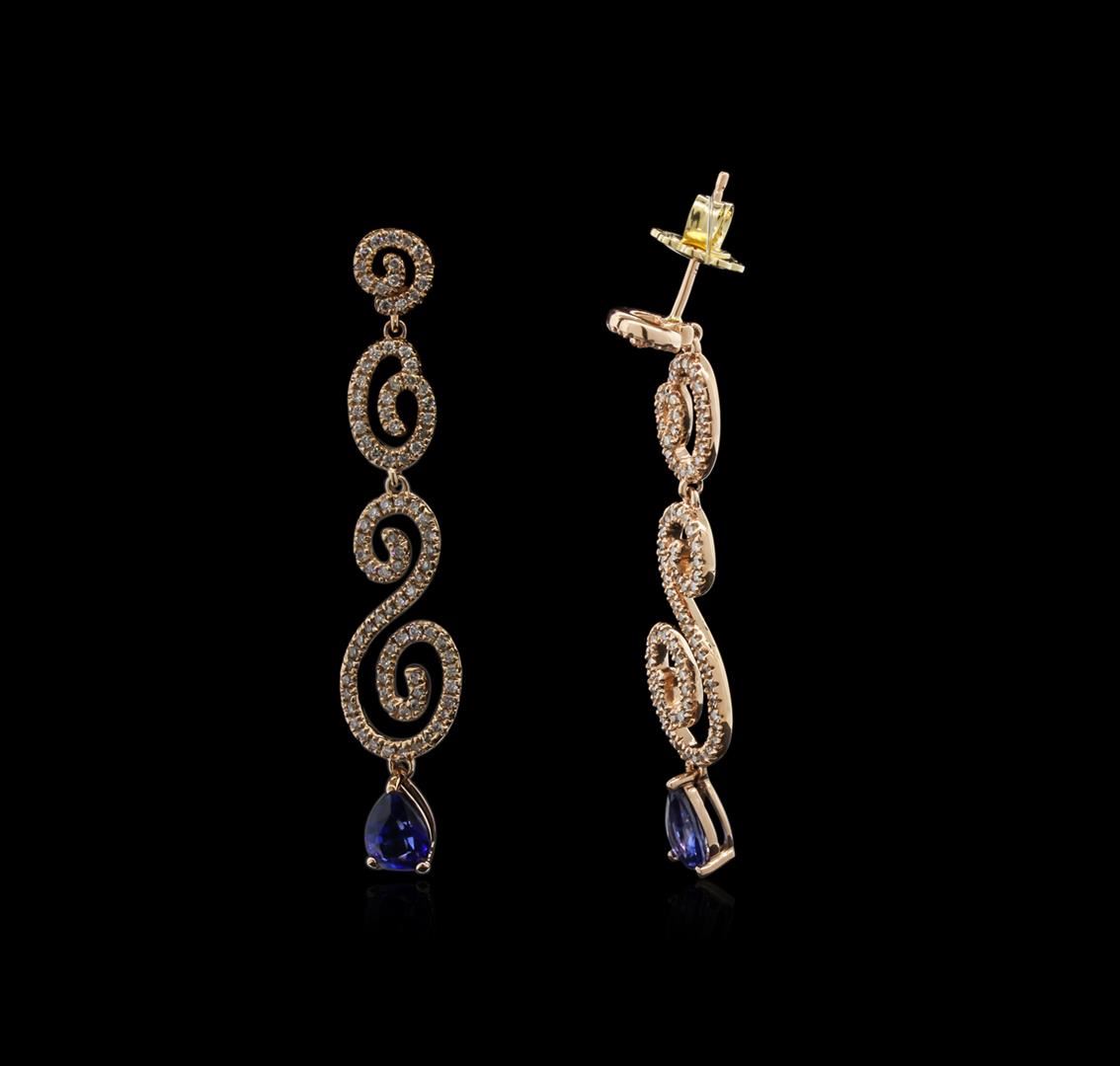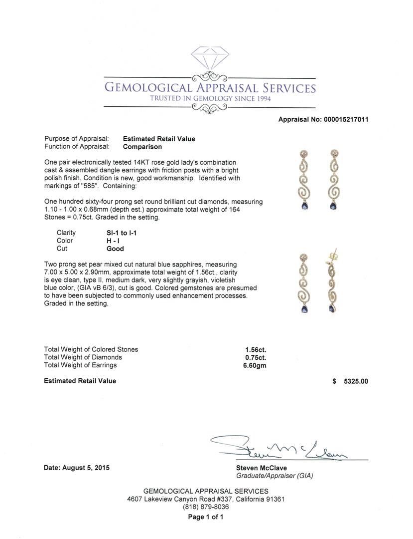One pair electronically tested 14KT rose gold lady's combination cast & assembled dangle earrings with friction posts with a bright polish finish. Identified with markings of "585". Condition is new, good workmanship. Containing: One Hundred Sixty-Four prong set round brilliant cut diamonds, measuring 1.10 - 1.00 x 0.68mm (depth est.) approximate. Total Weight of 164 Stones = 0.75ct. Graded in the setting. Clarity: SI-1 to I-1. Color: H - I. Cut Good Two prong set pear mixed cut natural blue sapphires, measuring 7.00 x 5.00 x 2.90mm, approximate. Total Weight of 1.56ct., clarity is eye clean, type II, medium dark, very slightly grayish, violetish blue color, (GIA vB 6/3), cut is good. Colored gemstones are presumed to have been subjected to commonly used enhancement processes. Graded in the setting. Total Weight of Colored Stones 1.56ct. Total Weight of Diamonds 0.75ct. Total Weight of Earrings 6.60gm. GAS Appraised at $5,325.00.