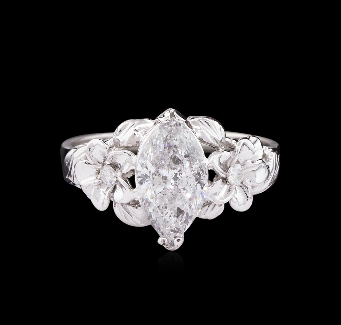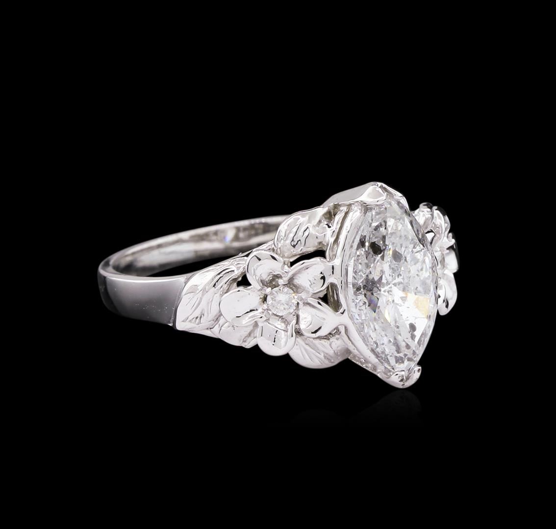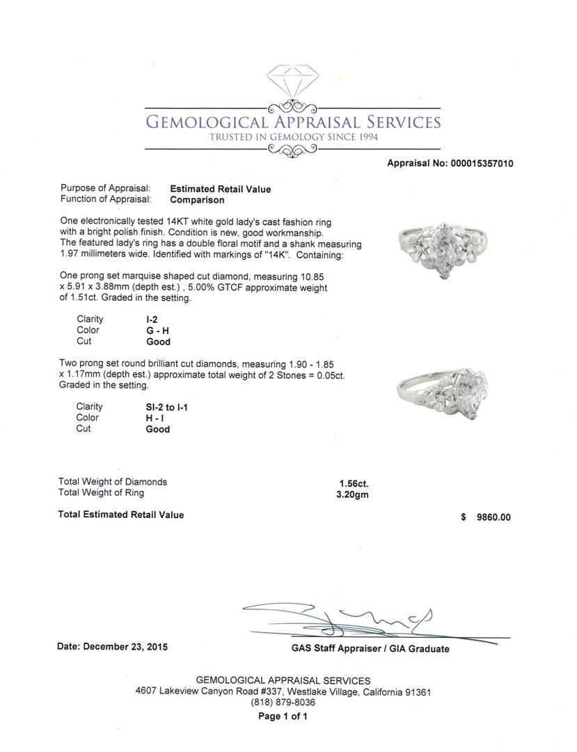 One electronically tested 14KT white gold lady's cast fashion ring with a bright polish finish. The featured lady's ring has a double floral motif and a shank measuring 1.97 millimeters wide. Identified with markings of "14K". Condition is new, good workmanship. Containing: One prong set marquise shaped cut diamond, measuring 10.85 x 5.91 x 3.88mm (depth est.) , 5.00% GTCF approximate weight of 1.51ct. Graded in the setting. Clarity: I-2. Color: G - Good Two prong set round brilliant cut diamonds, measuring 1.90 - 1.85 x 1.17mm (depth est.) approximate total weight of 2 Stones = 0.05ct. Graded in the setting. Clarity: SI-2 to I-1. Color: H - I. Cut Good. Total Weight of Diamonds 1.56ct. Total Weight of Ring 3.20gm. GAS Appraised at $9,860.00.