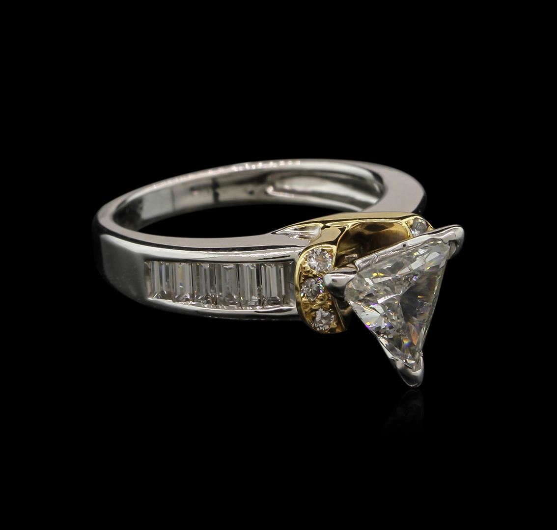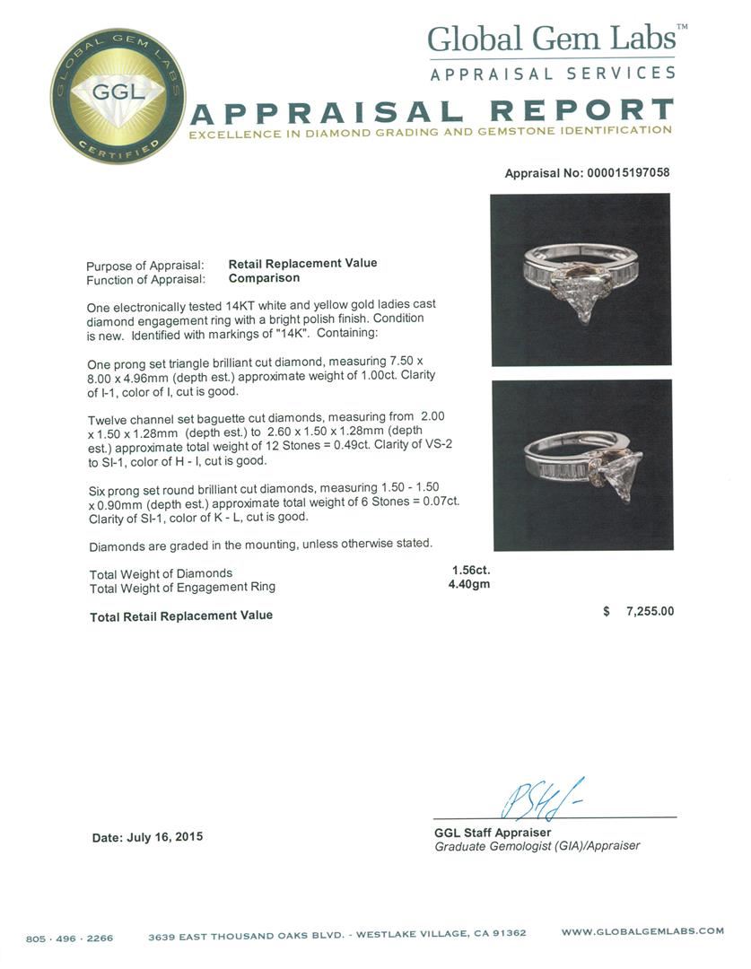 One electronically tested 14KT white and yellow gold ladies cast diamond engagement ring with a bright polish finish. Identified with markings of "14K". Condition is new. Containing: One prong set triangle brilliant cut diamond, measuring 7.50 x 8.00 x 4.96mm (depth est.) approximate weight of 1.00ct. Clarity: I-1. Color: I, Cut is Good. Twelve channel set baguette cut diamonds, measuring from 2.00 x 1.50 x 1.28mm (depth est.) to 2.60 x 1.50 x 1.28mm (depth est.) approximate total weight of 12 Stones = 0.49ct. Clarity: VS-2 to SI-1. Color: H - I, Cut is Good. Six prong set round brilliant cut diamonds, measuring 1.50 - 1.50 x 0.90mm (depth est.) approximate total weight of 6 Stones = 0.07ct. Clarity: SI-1. Color: K - L, Cut is Good. Diamonds are graded in the mounting, unless otherwise stated. Total Weight of Diamonds 1.56ct. Total Weight of Engagement Ring 4.40 grams. GGL Appraised at $7,255.00.