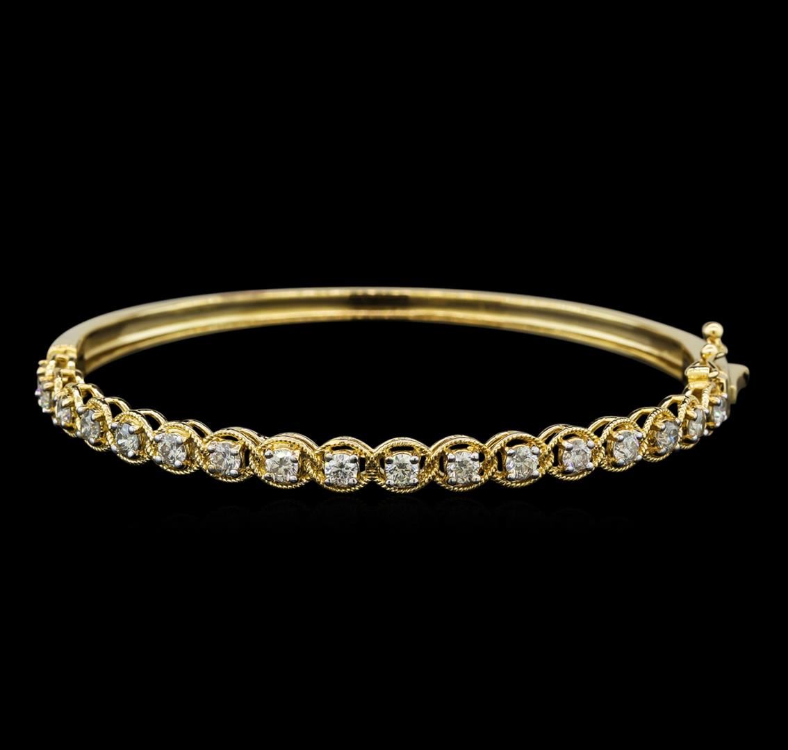 One electronically tested 14KT yellow gold lady's combination cast & assembled fashion bangle bracelet with a tongue clasp with foldover safety with a bright polish with milgrain detailing finish. The featured lady's bangle bracelet has a straight line motif and measures approximately 7 inches in length. Identified with markings of 'K14'. Condition is new, good workmanship. Containing: Seventeen prong set round brilliant cut diamonds, measuring 2.90 - 2.85 x 1.79mm (depth est.) approximate total weight of 17 Stones = 1.57ct. Graded in the setting. Clarity SI-1 to SI-2. Color: H - J Cut Very Good. Total Weight of Diamonds 1.57ct.. Total Weight of Bangle Bracelet 11.70gm. GAS Appraised at $6,025.00.