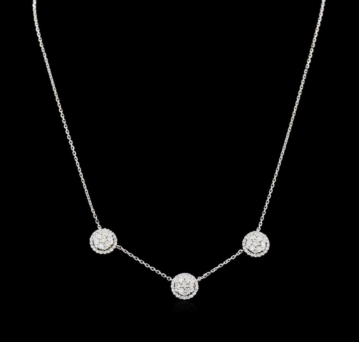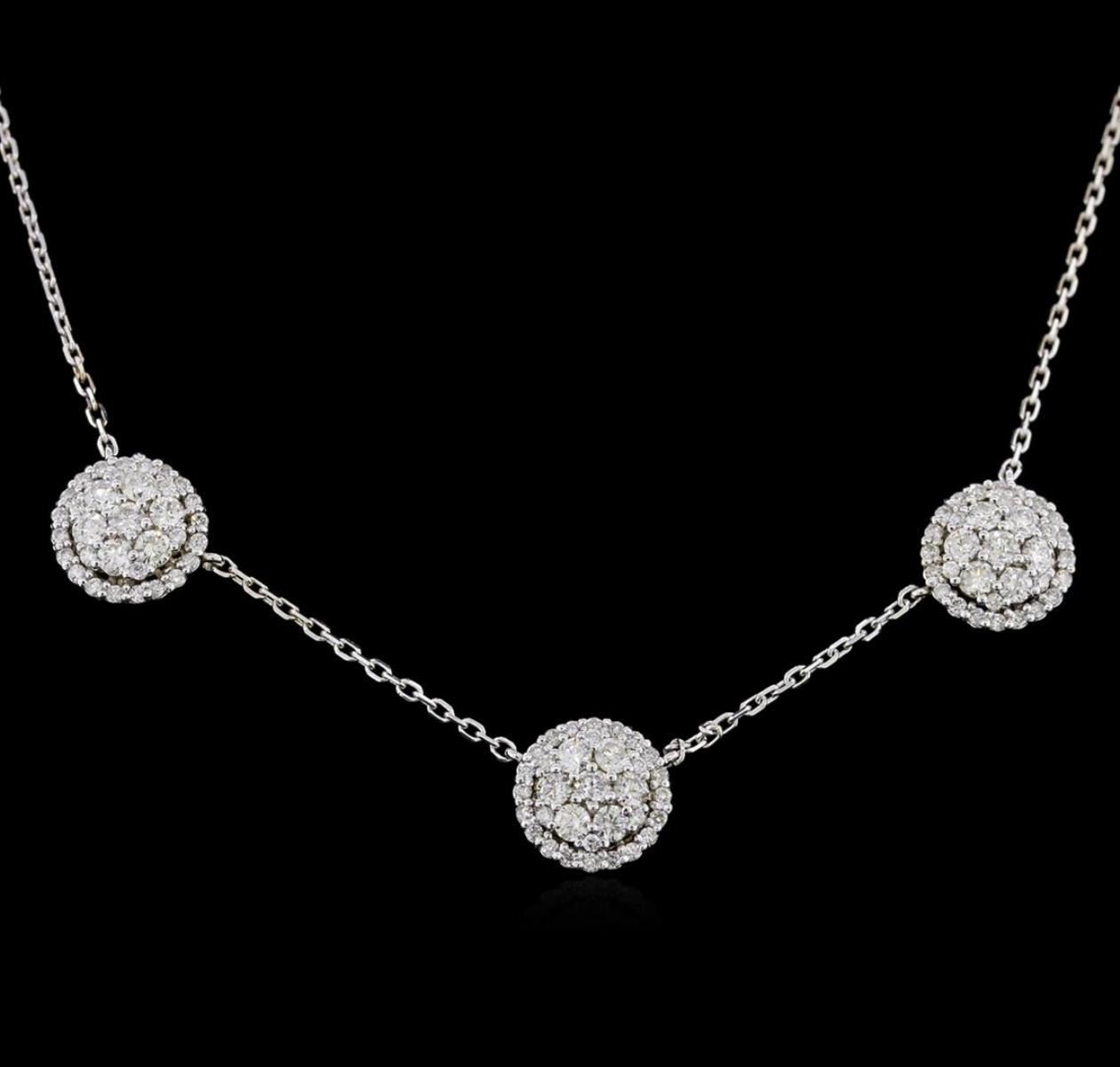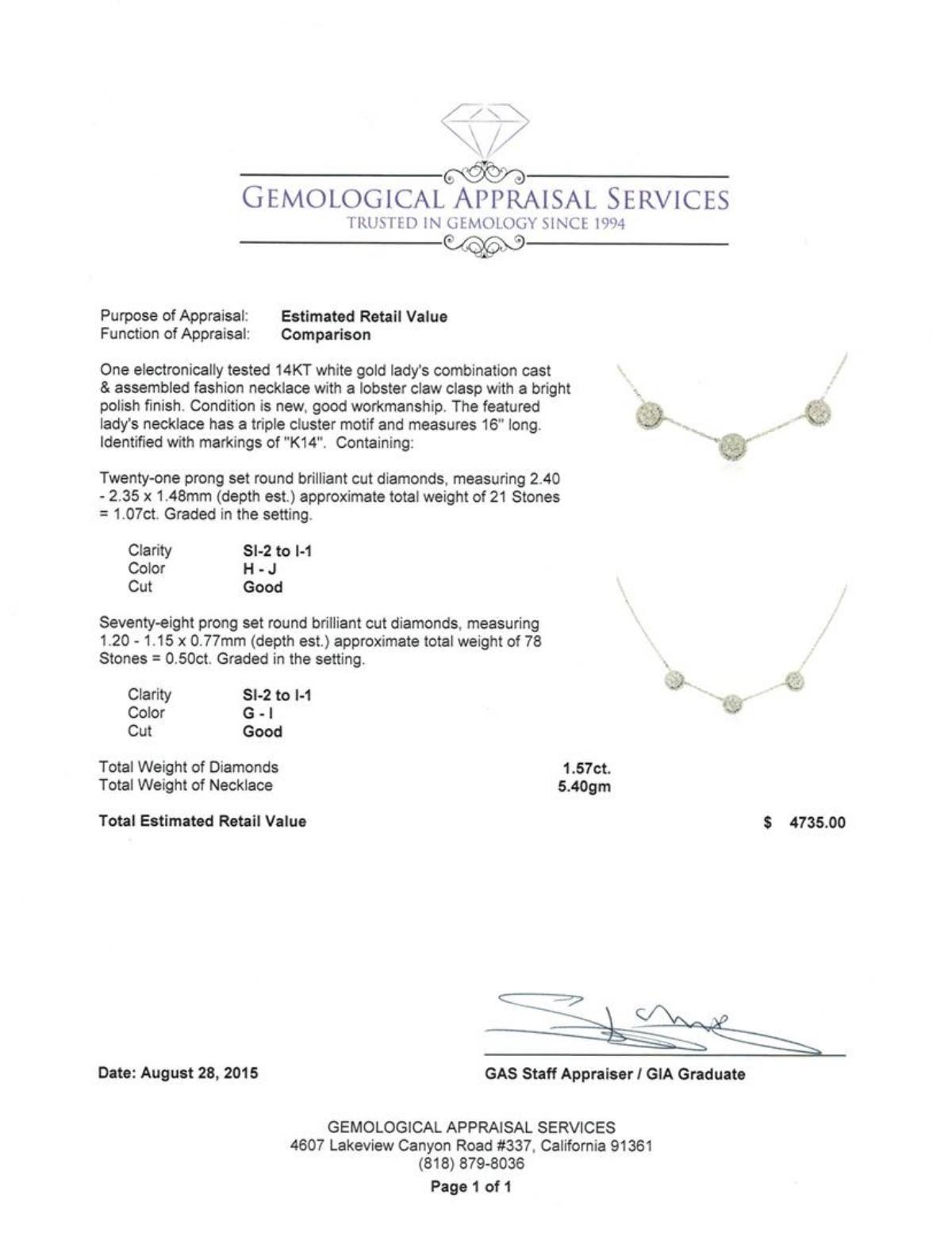 One electronically tested 14KT white gold lady's combination cast & assembled fashion necklace with a lobster claw clasp with a bright polish finish. The featured lady's necklace has a triple cluster motif and measures 16" long. Identified with markings of "K14". Condition is new, good workmanship. Containing: Twenty-One prong set round brilliant cut diamonds, measuring 2.40 - 2.35 x 1.48mm (depth est.) approximate total weight of 21 Stones = 1.07ct. Graded in the setting. Clarity: SI-2 to I-1. Color: H - Good Seventy-Eight prong set round brilliant cut diamonds, measuring 1.20 - 1.15 x 0.77mm (depth est.) approximate total weight of 78 Stones = 0.50 ct. Graded in the setting. Clarity: SI-2 to I-1. Color: G - I. Cut Good. Total Weight of Diamonds 1.57ct. Total Weight of Necklace 5.40gm. GAS Appraised at $4,735.00.