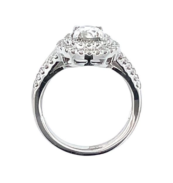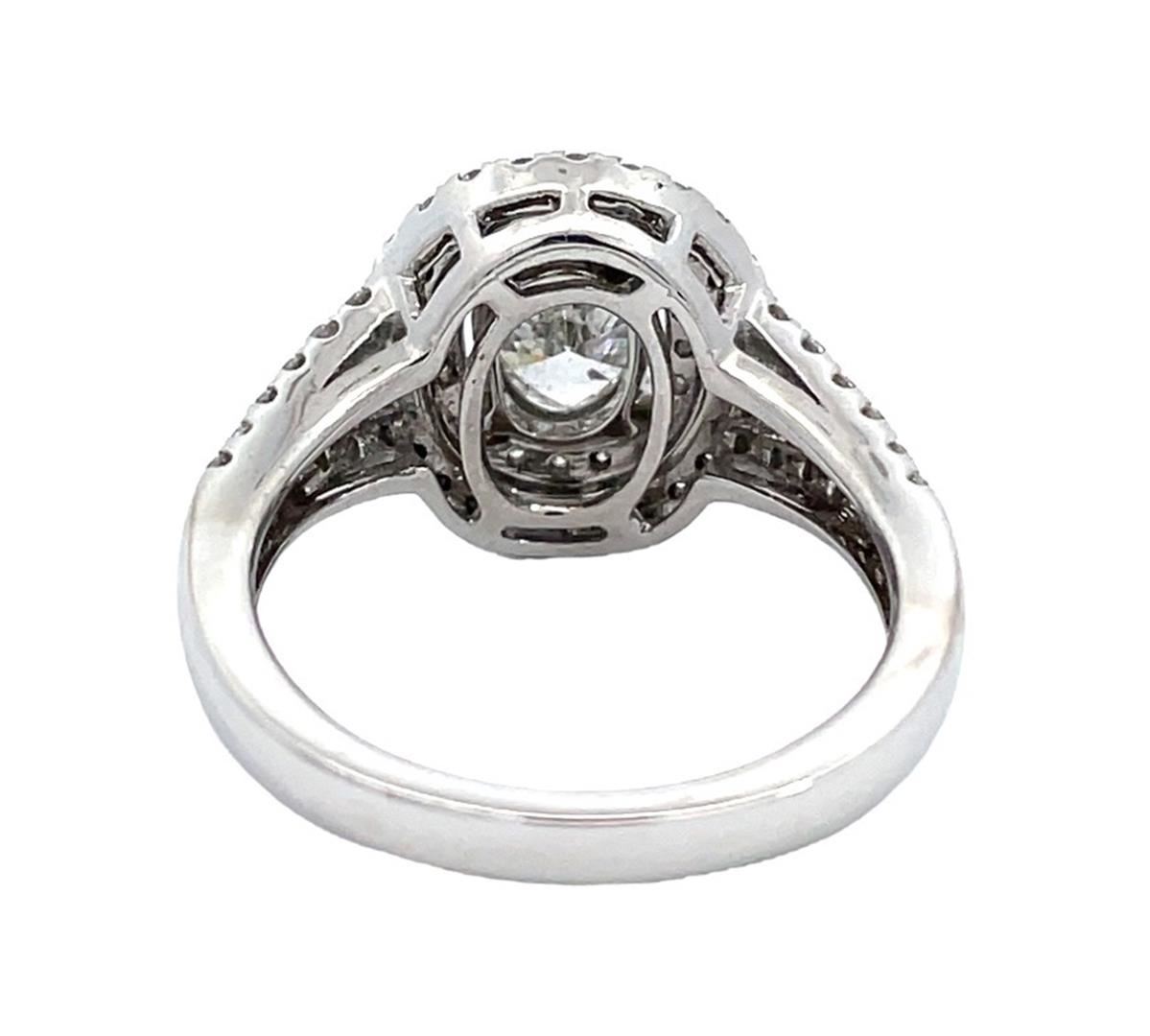 One electronically tested 14KT white gold lady's cast double oval halo wedding ring with a split shank with a bright polish finish. The featured lady's ring has a shank measuring 2.4 millimeters wide. Identified with markings of "14K". Condition is new, good workmanship. Containing: One prong set oval shaped cut diamond, measuring 7.68 x 5.48 x 3.40mm (depth est.), 8.00% GTCF approximate weight of 1.00ct. Graded in the setting. Color I - J Clarity I-1 Cut Very Good Seventy prong set round brilliant cut diamonds, measuring 1.30 - 1.25 x 0.79mm (depth est.) approximate total weight of 70 Stones = 0.57ct. Graded in the setting. Color G - H Clarity VS-2 to SI-2 Cut Very Good Total Weight of Diamonds 1.57ct. Total Weight of Wedding Ring 5.80gm