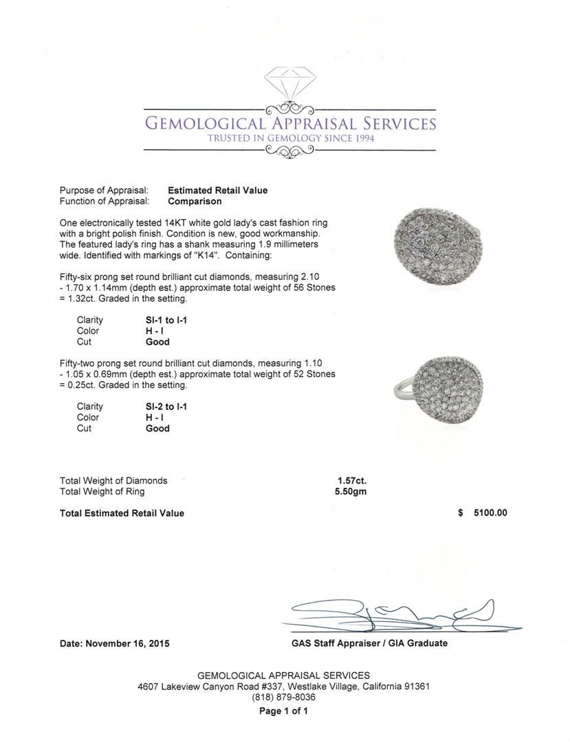 One electronically tested 14KT white gold lady's cast fashion ring with a bright polish finish. The featured lady's ring has a shank measuring 1.9 millimeters wide. Identified with markings of "K14". Condition is new, good workmanship. Containing: Fifty-Six prong set round brilliant cut diamonds, measuring 2.10 - 1.70 x 1.14mm (depth est.) approximate total weight of 56 Stones = 1.32ct. Graded in the setting. Clarity: SI-1 to I-1. Color: H - I. Cut Good Fifty-Two prong set round brilliant cut diamonds, measuring 1.10 - 1.05 x 0.69mm (depth est.) approximate total weight of 52 Stones = 0.25ct. Graded in the setting. Clarity: SI-2 to I-1. Color: H - I. Cut Good. Total Weight of Diamonds 1.57ct. Total Weight of Ring 5.50gm. GAS Appraised at $5,100.00.