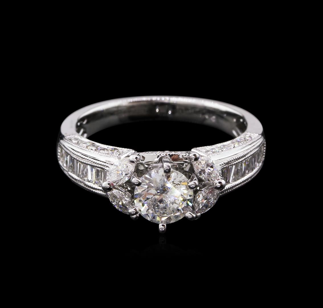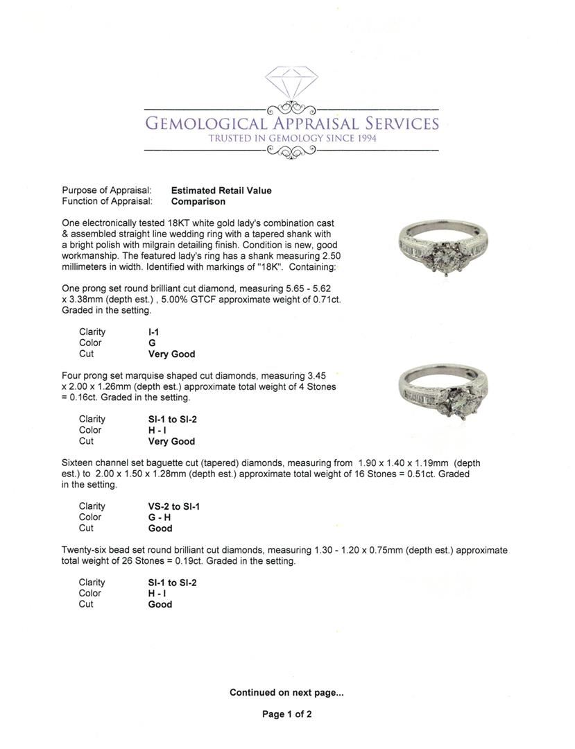 One electronically tested 18KT white gold lady's combination cast & assembled straight line wedding ring with a tapered shank with a bright polish with milgrain detailing finish. The featured lady's ring has a shank measuring 2.50 millimeters in width. Identified with markings of "18K". Condition is new, good workmanship. Containing: One prong set round brilliant cut diamond, measuring 5.65 - 5.62 x 3.38mm (depth est.) , 5.00% GTCF approximate weight of 0.71ct. Graded in the setting. Clarity: I-1. Color: Very Good Four prong set marquise shaped cut diamonds, measuring 3.45 x 2.00 x 1.26mm (depth est.) approximate total weight of 4 Stones = 0.16ct. Graded in the setting. Clarity: SI-1 to SI-2. Color: H - I. Cut Very Good Sixteen channel set baguette cut (tapered) diamonds, measuring from 1.90 x 1.40 x 1.19mm (depth est.) to 2.00 x 1.50 x 1.28mm (depth est.) approximate total weight of 16 Stones = 0.51ct. Graded in the setting. Clarity: VS-2 to SI-1. Color: G - Good Twenty-Six bead set round brilliant cut diamonds, measuring 1.30 - 1.20 x 0.75mm (depth est.) approximate total weight of 26 Stones = 0.19ct. Graded in the setting. Clarity: SI-1 to SI-2. Color: H - I. Cut Good. Total Weight of Diamonds 1.57ct. Total Weight of Wedding Ring 4.90gm GAS Appraised at $9,790.00.