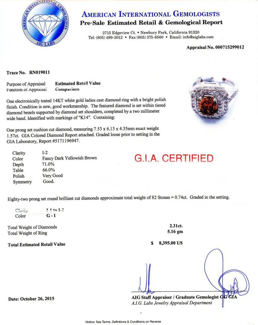 One electronically tested 14KT white gold ladies cast diamond ring with a bright polish finish. Condition is new, good workmanship. The featured diamond is set within tiered diamond bezels supported by diamond set shoulders, completed by a two millimeter wide band. Identified with markings of "K14". Containing: One prong set cushion cut diamond, measuring 7.53mm x 6.13mm x 4.35mm exact weight 1.57ct. GIA Colored Diamond Report attached. Graded loose prior to setting in the GIA Laboratory, Report #5171196947. Clarity I2 Color Fancy Dark Yellowish Brown Depth 71.0% Table 66.0% Polish Very Good Symmetry Good. Eighty-two prong set round brilliant cut diamonds approximate total weight of 82 Stones = 0.74ct. Graded in the setting. Clarity I1 to I2 Color G - I Total Weight of Diamonds 2.31ct. Total Weight of Ring 5.16 gm #Size: 6 1/2
