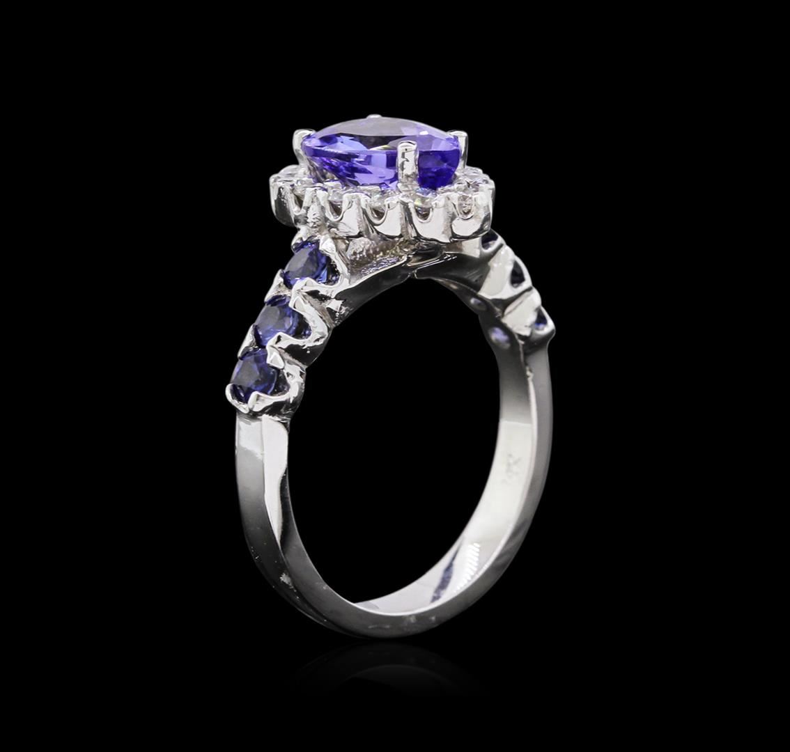 One ring featuring: 14KT white gold weighing 4.75 grams containing one tanzanite with a total weight of 1.57ct and 6 blue sapphires with a total weight of 0.60ct and diamonds with a total weight of 0.35ct.