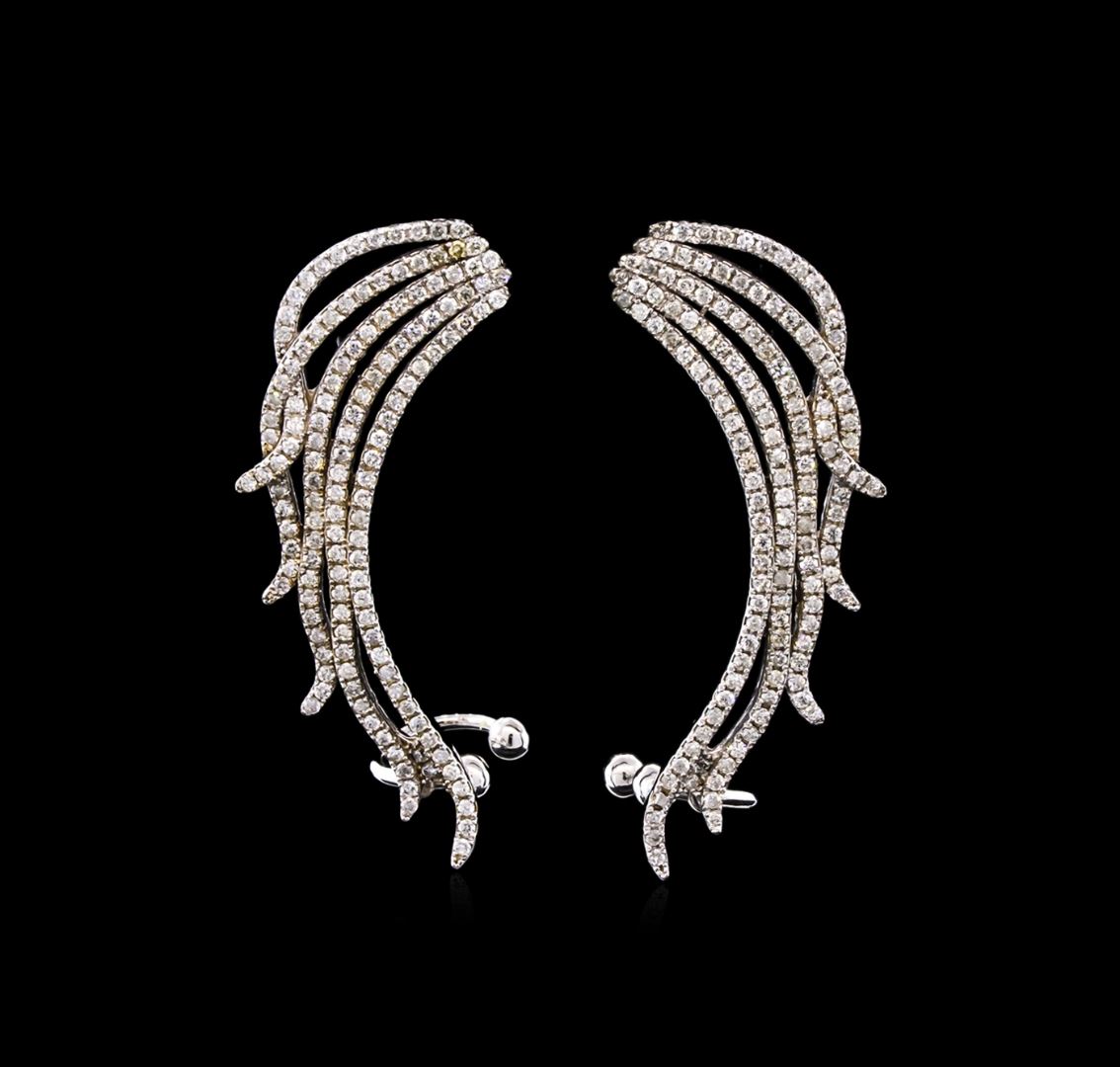 One pair electronically tested 14KT white gold ladies cast & assembled diamond earring cuffs with standard backs. Bright polish finish. Identified with markings of "585". Condition is new, good workmanship. Containing: Two Hundred Sixty-Eight prong set round brilliant cut diamonds approximate total weight of 268 Stones = 1.57ct. Graded in the setting. Clarity I-1 to I-2 Color H - J. Total Weight of Diamonds 1.57ct. Total Weight of Earring Cuffs 9.55 grams. AIG Appraised at $4,710.00.
