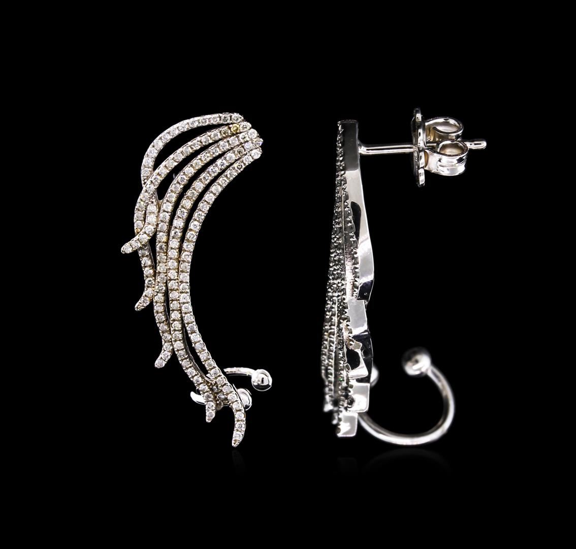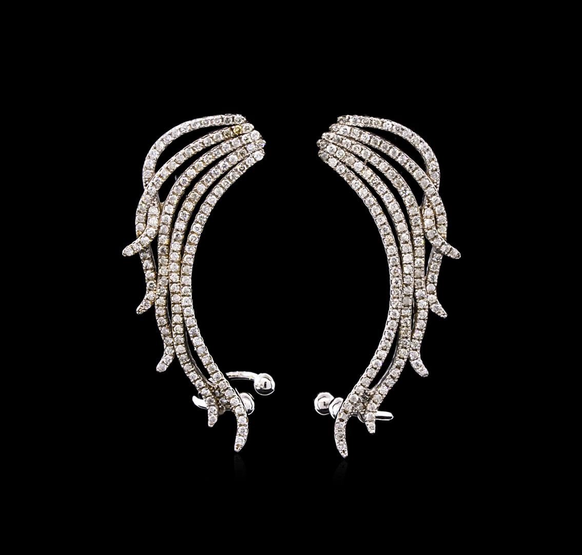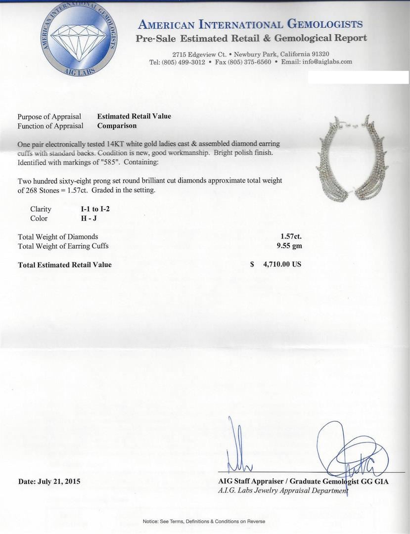 One pair electronically tested 14KT white gold ladies cast & assembled diamond earring cuffs with standard backs. Bright polish finish. Identified with markings of "585". Condition is new, good workmanship. Containing: Two Hundred Sixty-Eight prong set round brilliant cut diamonds approximate total weight of 268 Stones = 1.57ct. Graded in the setting. Clarity I-1 to I-2 Color H - J. Total Weight of Diamonds 1.57ct. Total Weight of Earring Cuffs 9.55 grams. AIG Appraised at $4,710.00.