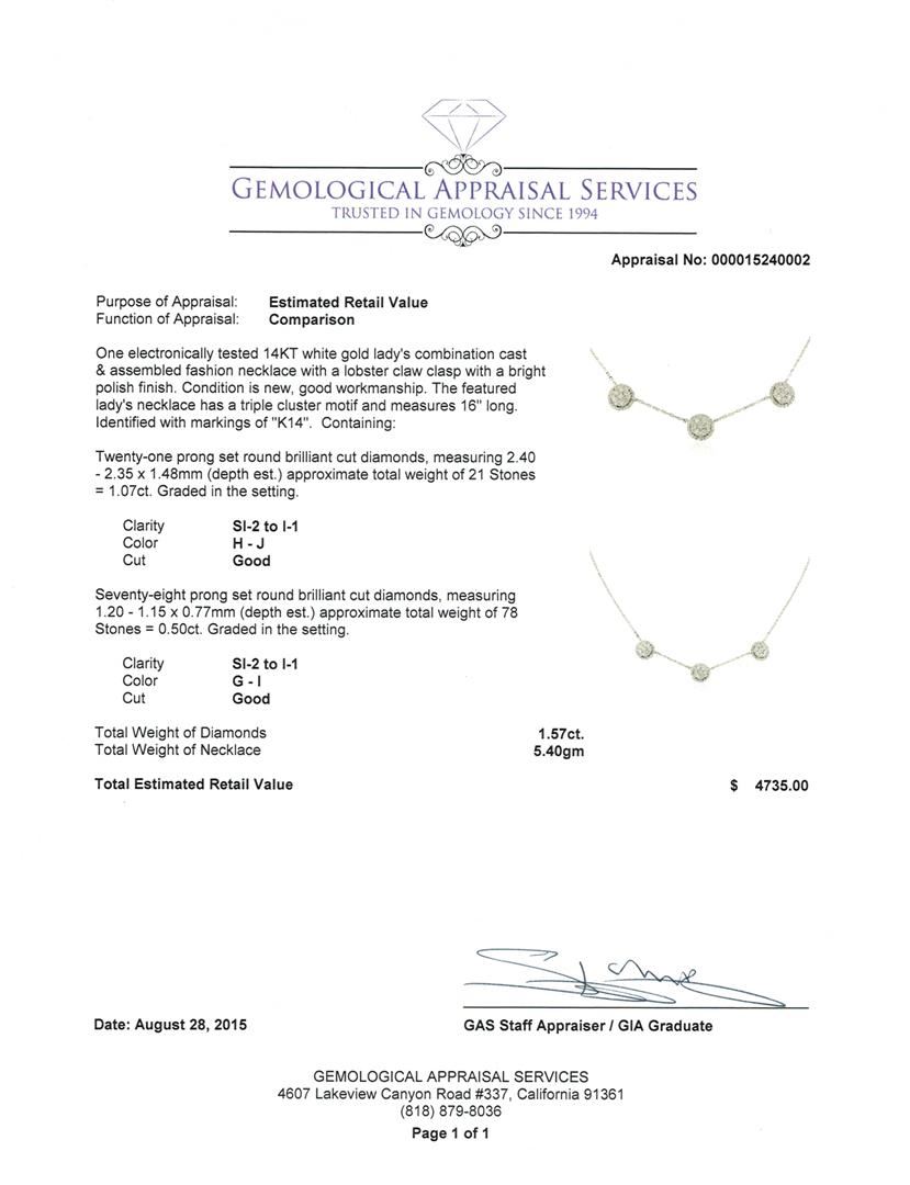 One electronically tested 14KT white gold lady's combination cast & assembled fashion necklace with a lobster claw clasp with a bright polish finish. The featured lady's necklace has a triple cluster motif and measures 16" long. Identified with markings of "K14". Condition is new, good workmanship. Containing: Twenty-One prong set round brilliant cut diamonds, measuring 2.40 - 2.35 x 1.48mm (depth est.) approximate total weight of 21 Stones = 1.07ct. Graded in the setting. Clarity: SI-2 to I-1. Color: H - Good Seventy-Eight prong set round brilliant cut diamonds, measuring 1.20 - 1.15 x 0.77mm (depth est.) approximate total weight of 78 Stones = 0.50ct. Graded in the setting. Clarity: SI-2 to I-1. Color: G - I. Cut Good. Total Weight of Diamonds 1.57ct. Total Weight of Necklace 5.40gm. GAS Appraised at $4,735.00.