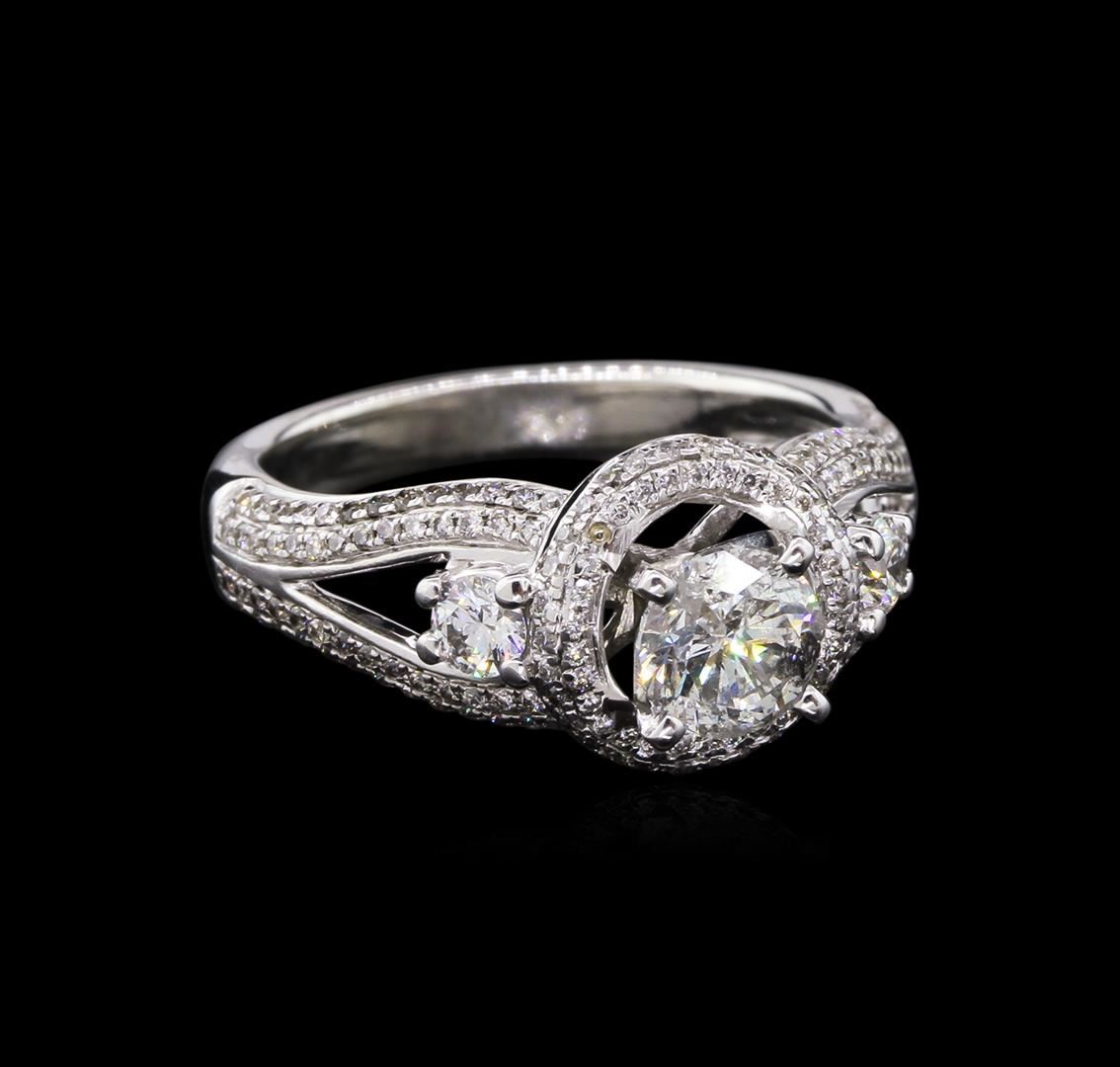 One electronically tested 14KT white gold lady's combination cast & assembled wedding ring with a split shank with a bright polish finish. The featured lady's ring has a shank measuring 2.91 millimeters wide. Identified with markings of "14K 585". Condition is new, good workmanship. Containing: One prong set round brilliant cut diamond, measuring 5.63 - 5.61 x 3.65mm (depth est.) , 3.00% GTCF approximate weight of 0.76ct. Graded in the setting. Clarity: I-1. Color: I. Cut Good Two prong set round brilliant cut diamonds, measuring 3.10 - 3.00 x 1.98mm (depth est.) approximate total weight of 2 Stones = 0.24ct. Graded in the setting. Clarity: VS-2 to SI-1. Color: H - I. Cut Good One Hundred Sixty-Eight bead set round brilliant cut diamonds, measuring 1.00 - 0.90 x 0.62mm (depth est.) approximate total weight of 168 Stones = 0.57ct. Graded in the setting. Clarity: VS-2 to SI-2. Color: G - I. Cut Very Good. Total Weight of Diamonds 1.57ct. Total Weight of Ring 4.90gm GAS Appraised at $9,155.00.