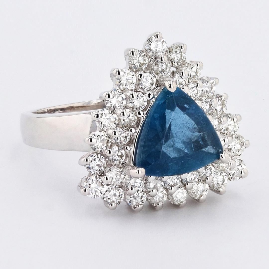 ONE 14K WHITE GOLD LADY'S CUSTOM MADE DIAMOND 6 AQUAMARINE RING. 6.40 GR TW CONTAINING: 1 â€" MAIN GEMSTONE : IDENTITY : ONE CENTER NATURAL AQUAMARINE SET IN PRONGS SETTING. CARAT WEIGHT : 1.58 CT. SHAPE & MEASUREMEMT : TRILLION CUT. QUALITY : FINE STRONG BLUE. 2 â€" ADJACENT GEMSTONES : IDENTITY : NATURAL DIAMONDS. SHAPE : ROUND BRILLIANT CUT. CARAT WEIGHT : 1.15 CTW. QUALITY : VS/SI CLARITY , G/H COLOR. ALL FINE CUTTING AND PROPORTIONS. TOTAL GEMSTONES WEIGHT : 2.73 CTW. #Size: 6 1/2