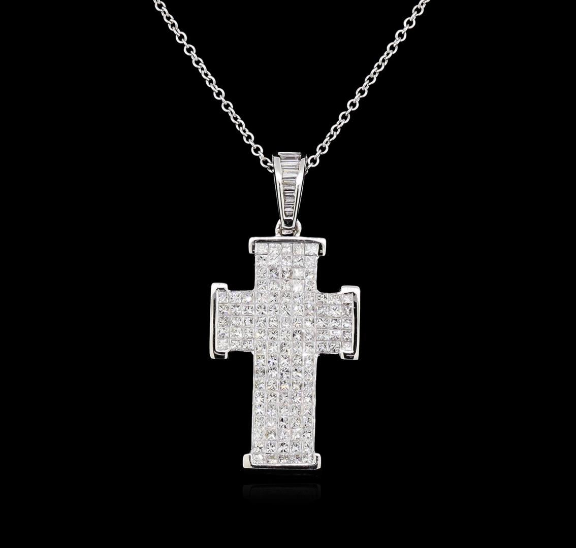 One electronically tested 18KT white gold cast & assembled diamond cross pendant with chain. One and one-quarter inch length cross pendant features an invisible set diamond gallery supported by a lattice under gallery, completed by a diamond ribbon bail. The pendant is supported by a sixteen inch length 14KT white gold cable chain, terminating in a lobster claw clasp. Bright polish finish. Identified with markings of "18K 750". Condition is new, good workmanship. Containing: One Hundred Twenty invisible set princess cut diamonds, measuring 1.40 x 1.20 x 0.90mm (depth est.) approximate total weight of 120 Stones = 1.50ct. Graded in the setting. Clarity: VS-2 to SI-2. Color: F - H Ten channel set baguette cut (tapered) diamonds, measuring from 1.10 x 0.70 x 0.49mm (depth est.) to 2.50 x 1.00 x 0.70mm (depth est.) approximate total weight of 10 Stones = 0.08ct. Graded in the setting. Clarity: SI-1 to SI-2. Color: G - I. Total Weight of Diamonds 1.58ct. Total Weight of Pendant With Chain 8.38gm. AIG Appraised at $6,495.00.