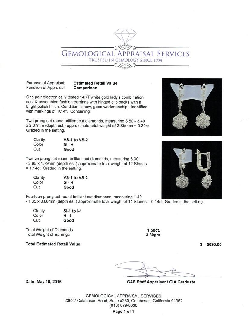 One pair electronically tested 14KT white gold lady's combination cast & assembled fashion earrings with hinged clip backs with a bright polish finish. Identified with markings of "K14". Condition is new, good workmanship. Containing: Two prong set round brilliant cut diamonds, measuring 3.50 - 3.40 x 2.07mm (depth est.) approximate total weight of 2 Stones = 0.30ct. Graded in the setting. Clarity: VS-1 to VS-2. Color: G - Good Twelve prong set round brilliant cut diamonds, measuring 3.00 - 2.95 x 1.79mm (depth est.) approximate total weight of 12 Stones = 1.14ct. Graded in the setting. Clarity: VS-1 to VS-2. Color: G - Good Fourteen prong set round brilliant cut diamonds, measuring 1.40 - 1.35 x 0.86mm (depth est.) approximate total weight of 14 Stones = 0.14ct. Graded in the setting. Clarity: SI-1 to I-1. Color: H - I. Cut Good. Total Weight of Diamonds 1.58ct. Total Weight of Earrings 3.80gm. GAS Appraised at $5,090.00.
