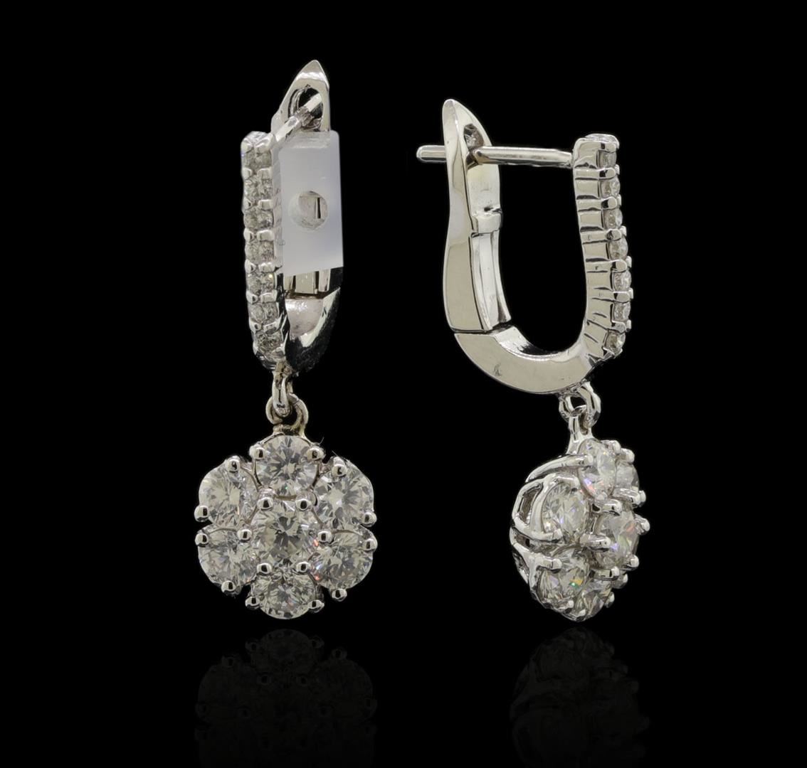 One pair electronically tested 14KT white gold lady's combination cast & assembled fashion earrings with hinged clip backs with a bright polish finish. Identified with markings of "K14". Condition is new, good workmanship. Containing: Two prong set round brilliant cut diamonds, measuring 3.50 - 3.40 x 2.07mm (depth est.) approximate total weight of 2 Stones = 0.30ct. Graded in the setting. Clarity: VS-1 to VS-2. Color: G - Good Twelve prong set round brilliant cut diamonds, measuring 3.00 - 2.95 x 1.79mm (depth est.) approximate total weight of 12 Stones = 1.14ct. Graded in the setting. Clarity: VS-1 to VS-2. Color: G - Good Fourteen prong set round brilliant cut diamonds, measuring 1.40 - 1.35 x 0.86mm (depth est.) approximate total weight of 14 Stones = 0.14ct. Graded in the setting. Clarity: SI-1 to I-1. Color: H - I. Cut Good. Total Weight of Diamonds 1.58ct. Total Weight of Earrings 3.80gm. GAS Appraised at $5,090.00.