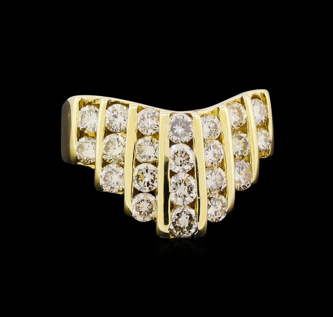 One electronically tested 14KT yellow gold ladies cast diamond ring with a bright polish finish. The ring features an array of tapering diamond ribbons supported by tapering shoulders, completed by a three millimeter wide band. Identified with markings of "14K". Condition is new, good workmanship. Containing: Twenty-Two channel set round brilliant cut diamonds, measuring 2.90 - 2.50 x 1.62mm (depth est.) approximate total weight of 22 Stones = 1.58ct. Graded in the setting. Clarity: SI-2 to I-1. Color: H - J. Total Weight of Diamonds 1.58ct. Total Weight of Ring 6.35gm. AIG Appraised at $5,355.00.