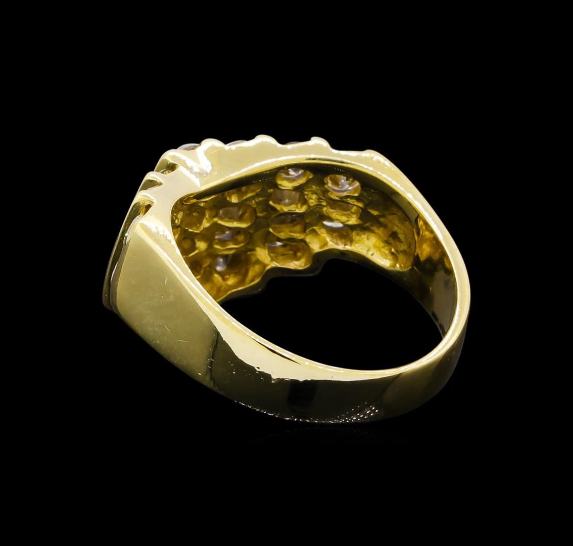 One electronically tested 14KT yellow gold ladies cast diamond ring with a bright polish finish. The ring features an array of tapering diamond ribbons supported by tapering shoulders, completed by a three millimeter wide band. Identified with markings of "14K". Condition is new, good workmanship. Containing: Twenty-Two channel set round brilliant cut diamonds, measuring 2.90 - 2.50 x 1.62mm (depth est.) approximate total weight of 22 Stones = 1.58ct. Graded in the setting. Clarity: SI-2 to I-1. Color: H - J. Total Weight of Diamonds 1.58ct. Total Weight of Ring 6.35gm. AIG Appraised at $5,355.00.