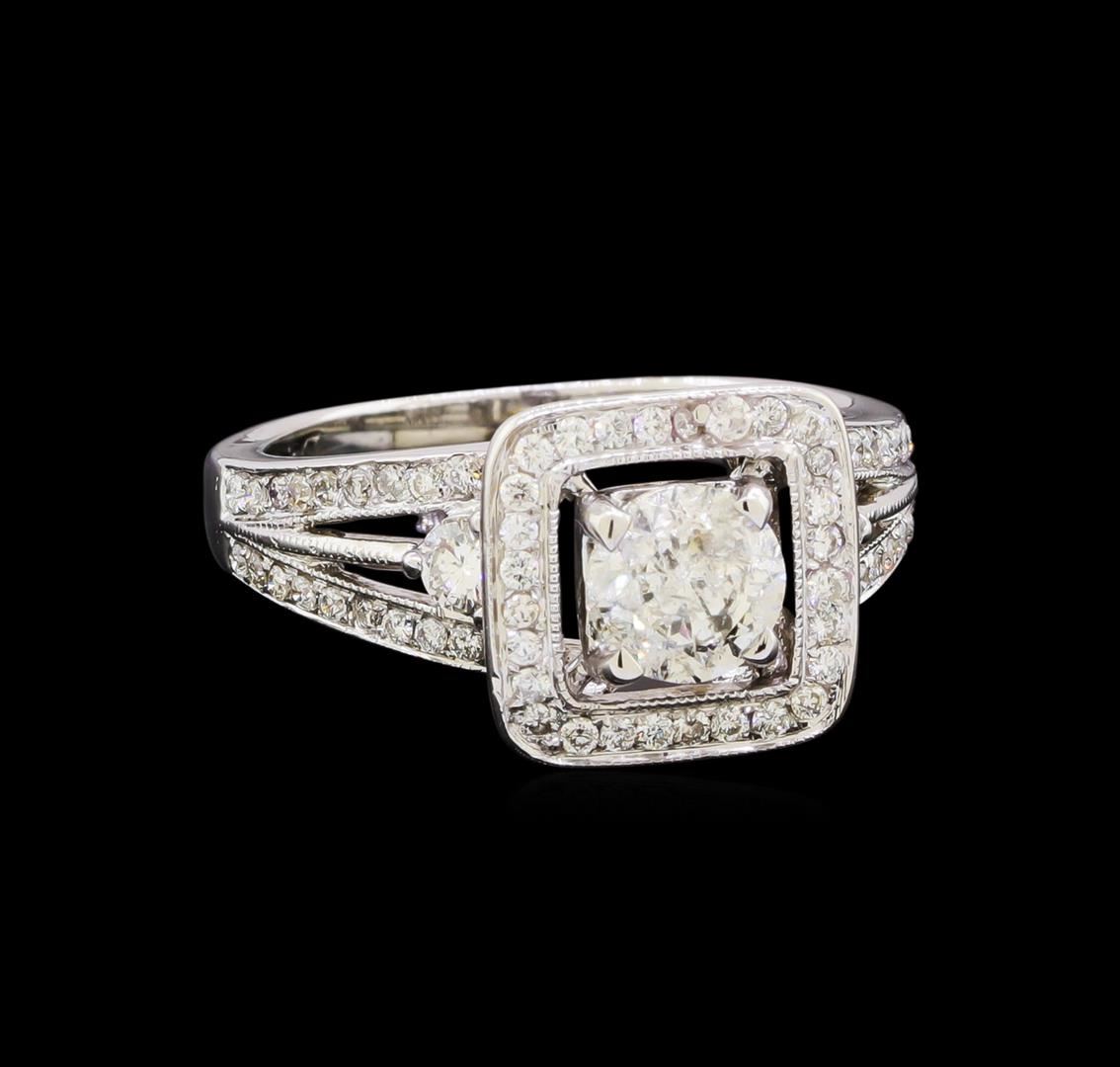One electronically tested 18KT white gold lady's combination cast & assembled split shank halo wedding ring with a bright polish with milgrain detailing finish. The featured lady's ring has a shank measuring 2.0 millimeters in width. Trademark is ODELIA. Identified with markings of "18K". Condition is new, good workmanship. Containing: One prong set round brilliant cut diamond, measuring 5.52 - 5.48 x 3.48mm (depth est.) , 8.00.%. GTCF approximate weight of 0.71ct. Graded in the setting. Clarity: I-1. Color: G - Good Two prong set round brilliant cut diamonds, measuring 2.70 - 2.60 x 1.67mm (depth est.) approximate total weight of 2 Stones = 0.15ct. Graded in the setting. Clarity: VS-2 to SI-1. Color: G - Very Good Seventy-Six prong set round brilliant cut diamonds, measuring 1.40 - 1.30 x 0.84mm (depth est.) approximate total weight of 76 Stones = 0.72ct. Graded in the setting. Clarity: SI-1 to SI-2. Color: H - I. Cut Good. Total Weight of Diamonds 1.58ct. Total Weight of Ring 4.70gm. GAS Appraised at $7,340.00.