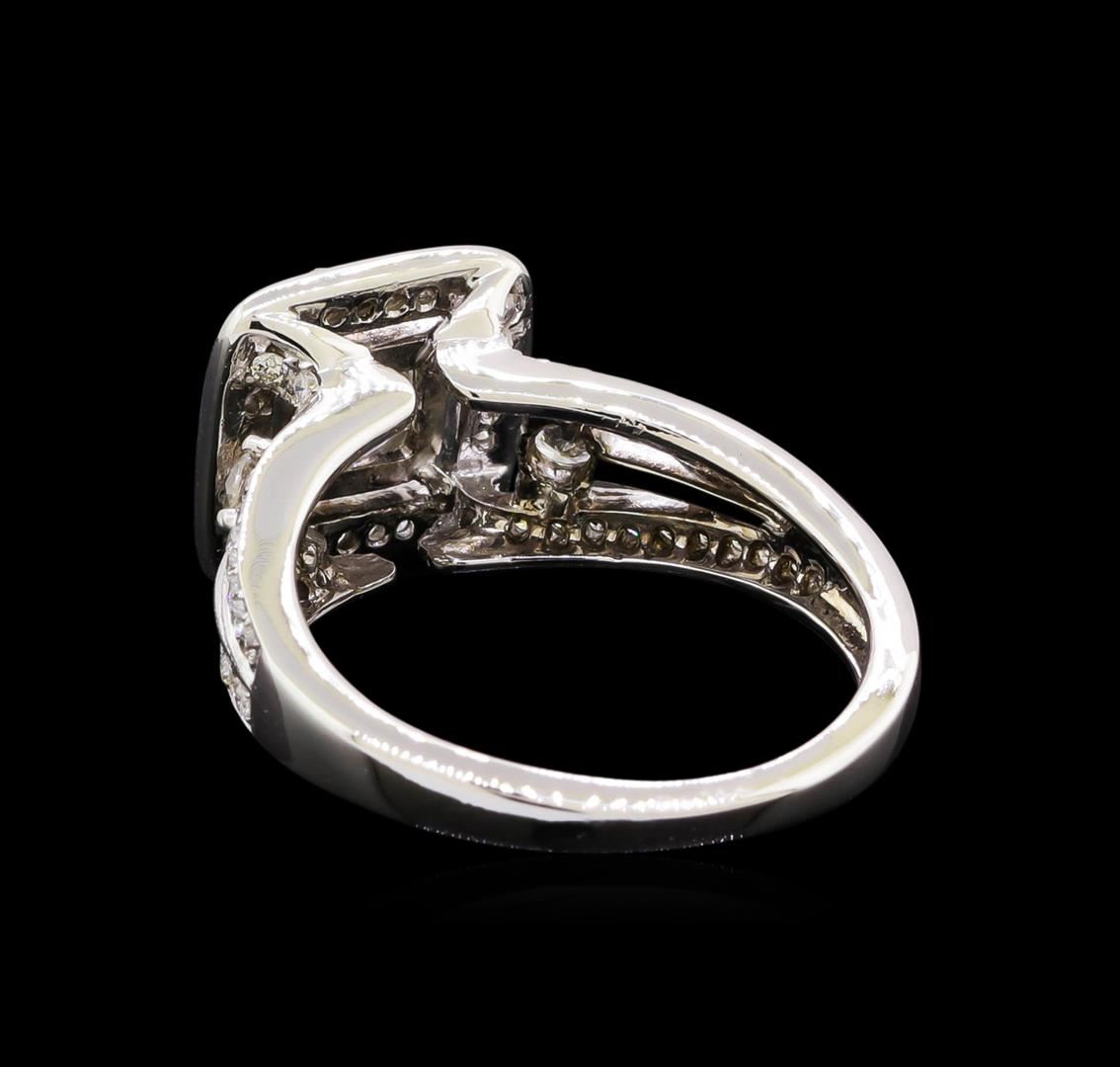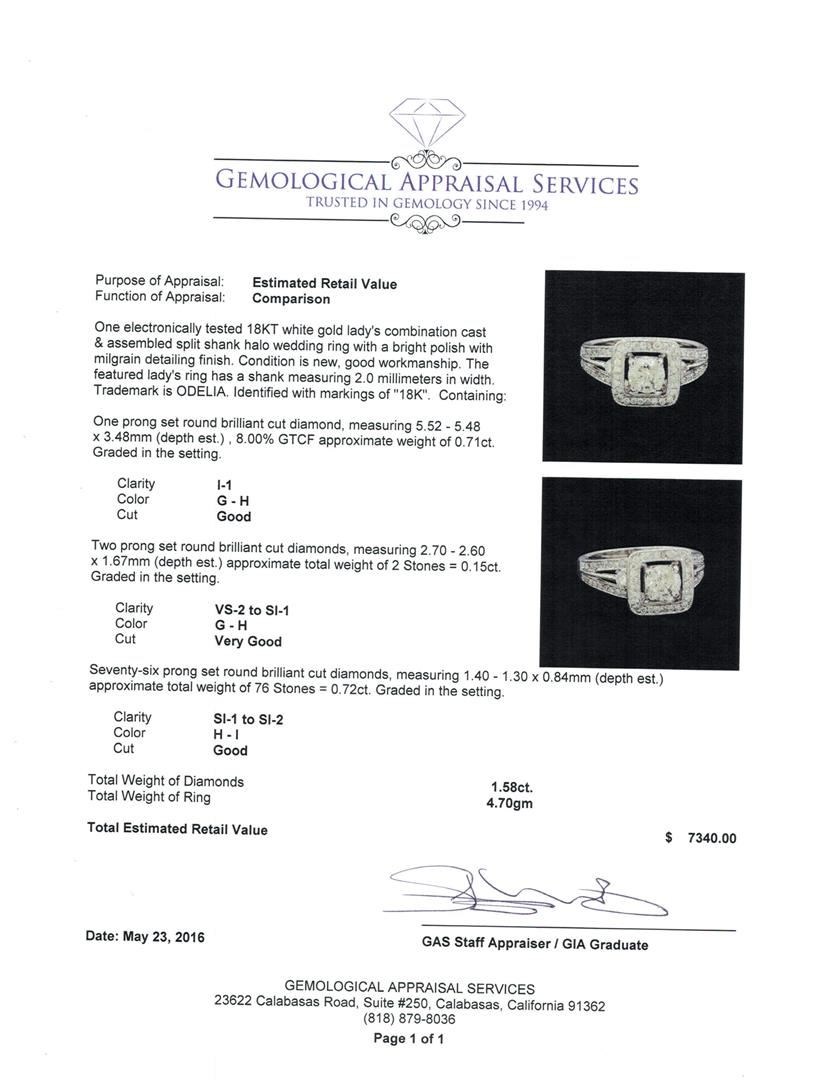 One electronically tested 18KT white gold lady's combination cast & assembled split shank halo wedding ring with a bright polish with milgrain detailing finish. The featured lady's ring has a shank measuring 2.0 millimeters in width. Trademark is ODELIA. Identified with markings of "18K". Condition is new, good workmanship. Containing: One prong set round brilliant cut diamond, measuring 5.52 - 5.48 x 3.48mm (depth est.) , 8.00.%. GTCF approximate weight of 0.71ct. Graded in the setting. Clarity: I-1. Color: G - Good Two prong set round brilliant cut diamonds, measuring 2.70 - 2.60 x 1.67mm (depth est.) approximate total weight of 2 Stones = 0.15ct. Graded in the setting. Clarity: VS-2 to SI-1. Color: G - Very Good Seventy-Six prong set round brilliant cut diamonds, measuring 1.40 - 1.30 x 0.84mm (depth est.) approximate total weight of 76 Stones = 0.72ct. Graded in the setting. Clarity: SI-1 to SI-2. Color: H - I. Cut Good. Total Weight of Diamonds 1.58ct. Total Weight of Ring 4.70gm. GAS Appraised at $7,340.00.