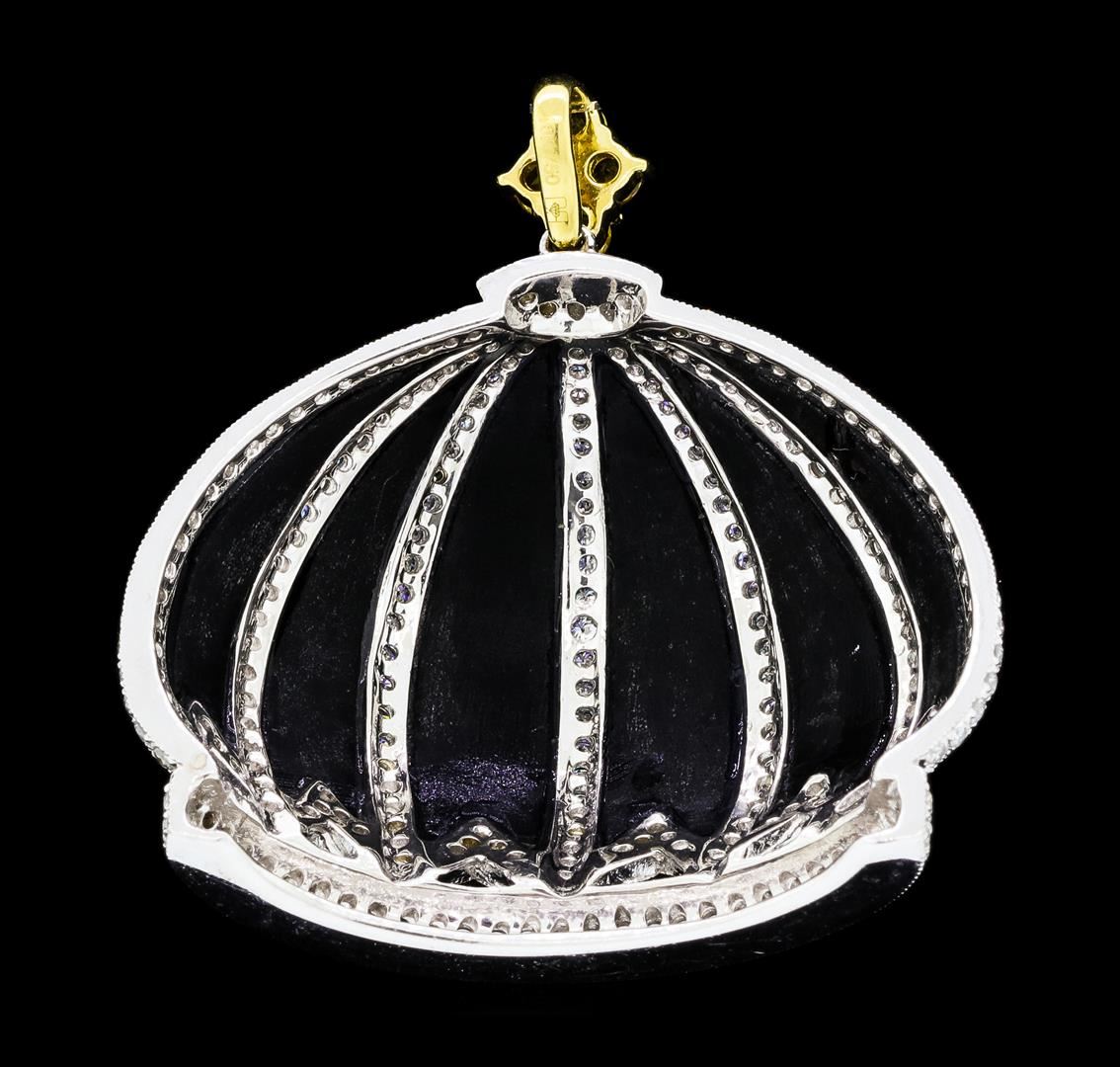 One electronically tested 18KT white and yellow gold lady's combination cast & assembled fashion crown motif pendant with a bright polish with milgrain detailing finish. The featured lady's pendant contains six pieces of inlaid onyx. Identified with markings of '18K 750'. Condition is new, good workmanship. Containing: Four prong set round modified brilliant cut natural yellow sapphires, measuring 2.70 - 2.60 x 1.72 mm, (depth est.) approximate total weight of 0.40ct., clarity is slightly included, medium, moderately strong, yellow color, (GIA Y 5/4), cut is good. Transmitting light with no distortion, transparent. Colored gemstones are presumed to have been subjected to commonly used enhancement processes. Graded in the setting. Two Hundred Forty-Five bead set round brilliant cut diamonds, measuring 1.30 - 1.10 x 0.74mm (depth est.) approximate total weight of 245 Stones = 1.58ct. Graded in the setting. Color G - H Clarity VS-2 to SI-1 Cut Very Good. Total Weight of Colored Stones 0.40ct.. Total Weight of Diamonds 1.58ct.. Total Weight of Pendant 11.30gm GAS Appraised at $8000.00. GAS Appraised at $8,000.00.