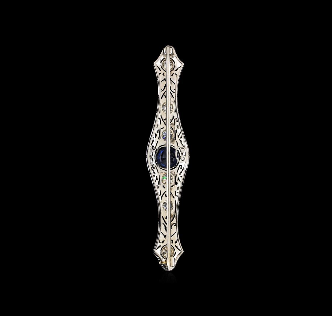 One electronically tested 18KT white gold lady's combination cast and assembled pin with an antiqued finish. Condition is new. Containing: one gypsy set round modified brilliant cut natural blue sapphire, measuring 7.50 - 7.50 x 3.50 mm, approximate weight of 1.58ct., eye clean clarity, type II, medium light, very slightly grayish, blue color, (GIA B 4/3), cut is good. Colored gemstones are presumed to have been subjected to commonly used enhancement processes. Six gypsy set old European cut diamonds, measuring 4.10 - 3.80 x 2.36mm (depth est.) approximate total weight of 6 Stones = 1.35ct. Clarity of SI-1, color of J-K, cut is good. Total Weight of Colored Stones: 1.58ct, Total Weight of Diamonds: 1.35ct., Total Weight of Pin: 8.20 grams. GGL Appraised at $7,750.00.