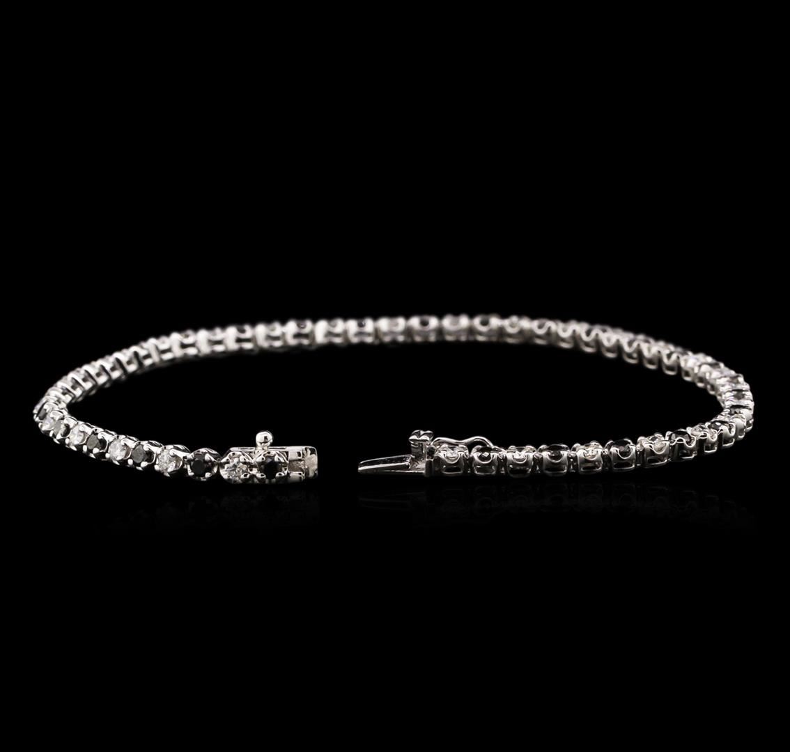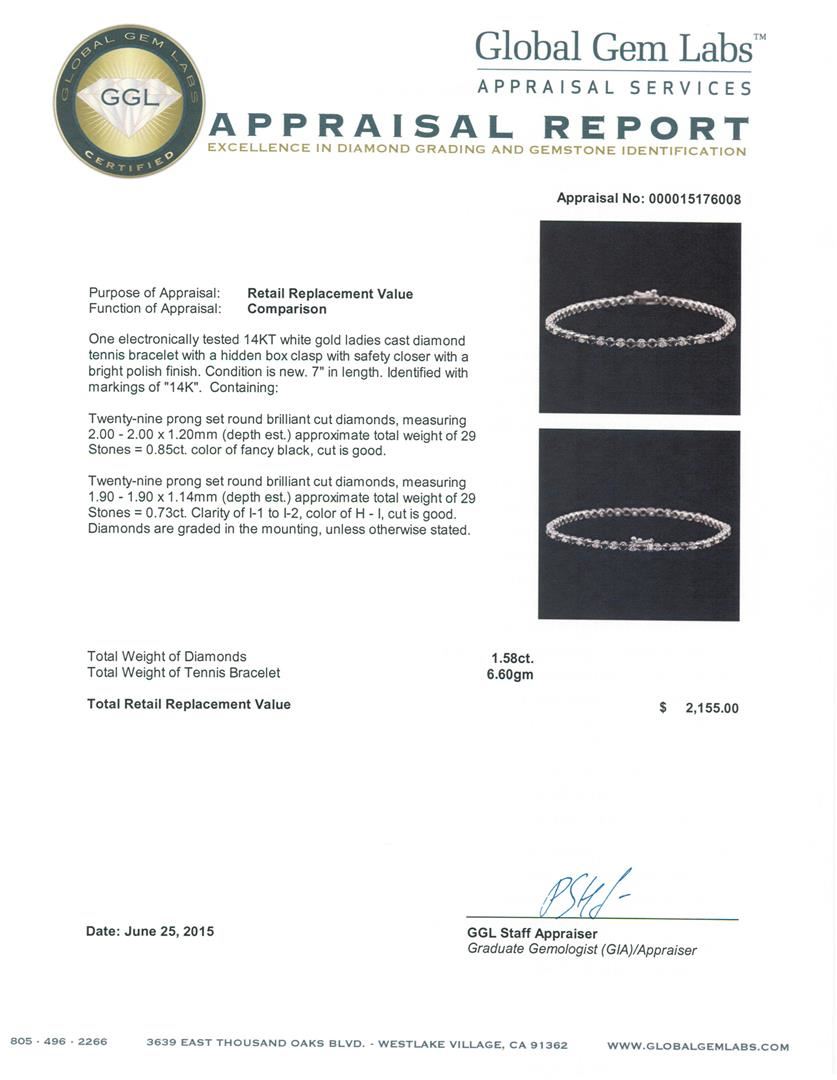 One electronically tested 14KT white gold ladies cast diamond tennis bracelet with a hidden box clasp with safety closer with a bright polish finish. 7" in length. Identified with markings of "14K". Condition is new. Containing: Twenty-Nine prong set round brilliant cut diamonds, measuring 2.00 - 2.00 x 1.20mm (depth est.) approximate total weight of 29 Stones = 0.85ct. Cut is Good. Twenty-Nine prong set round brilliant cut diamonds, measuring 1.90 - 1.90 x 1.14mm (depth est.) approximate total weight of 29 Stones = 0.73ct. Clarity: I-1 to I-2. Color: H - I, Cut is Good. Diamonds are graded in the mounting, unless otherwise stated. Total Weight of Diamonds 1.58ct. Total Weight of Tennis Bracelet 6.60 grams. GGL Appraised at $2,155.00.