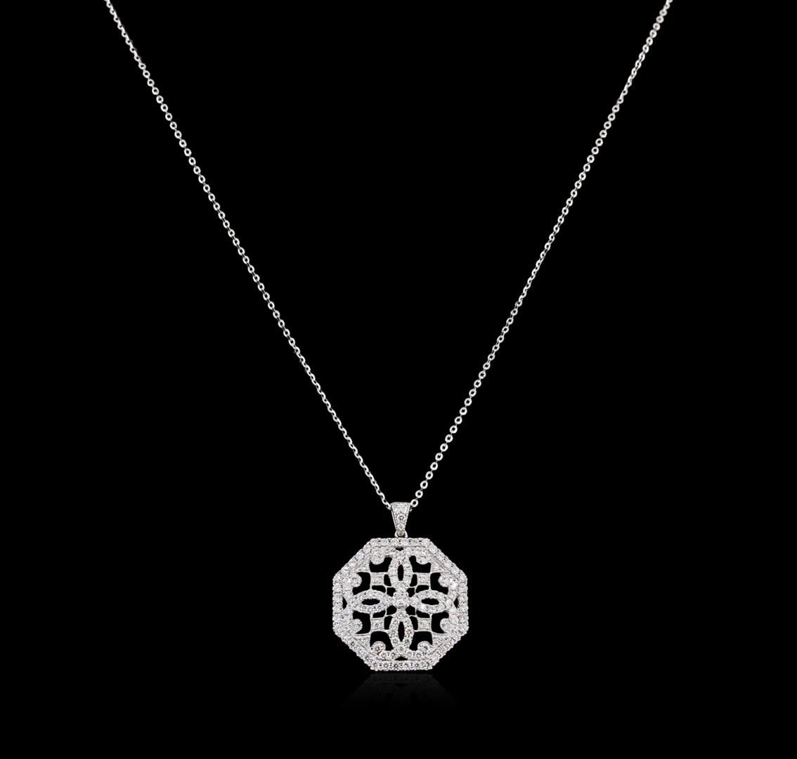 One electronically tested 14KT white gold lady's combination cast & assembled fashion pendant & chain 18.0" long, 1mm flat cable link with a spring ring clasp with a bright polish finish. Identified with markings of "14K". Condition is new, good workmanship. Containing: One prong set round brilliant cut diamond, measuring 2.60 - 2.50 x 1.85mm (depth est.) approximate weight of 0.08ct. Graded in the setting. Clarity SI-1 Color Good One Hundred Seven prong set round brilliant cut diamonds, measuring 1.55 - 1.50 x 0.99mm (depth est.) approximate total weight of 107 Stones = 1.50ct. Graded in the setting. Clarity SI-1 to SI-2 Color H - Good Total Weight of Diamonds 1.58ct. Total Weight of Pendant & Chain 5.30gm GAS Appraised at $7,955.00.