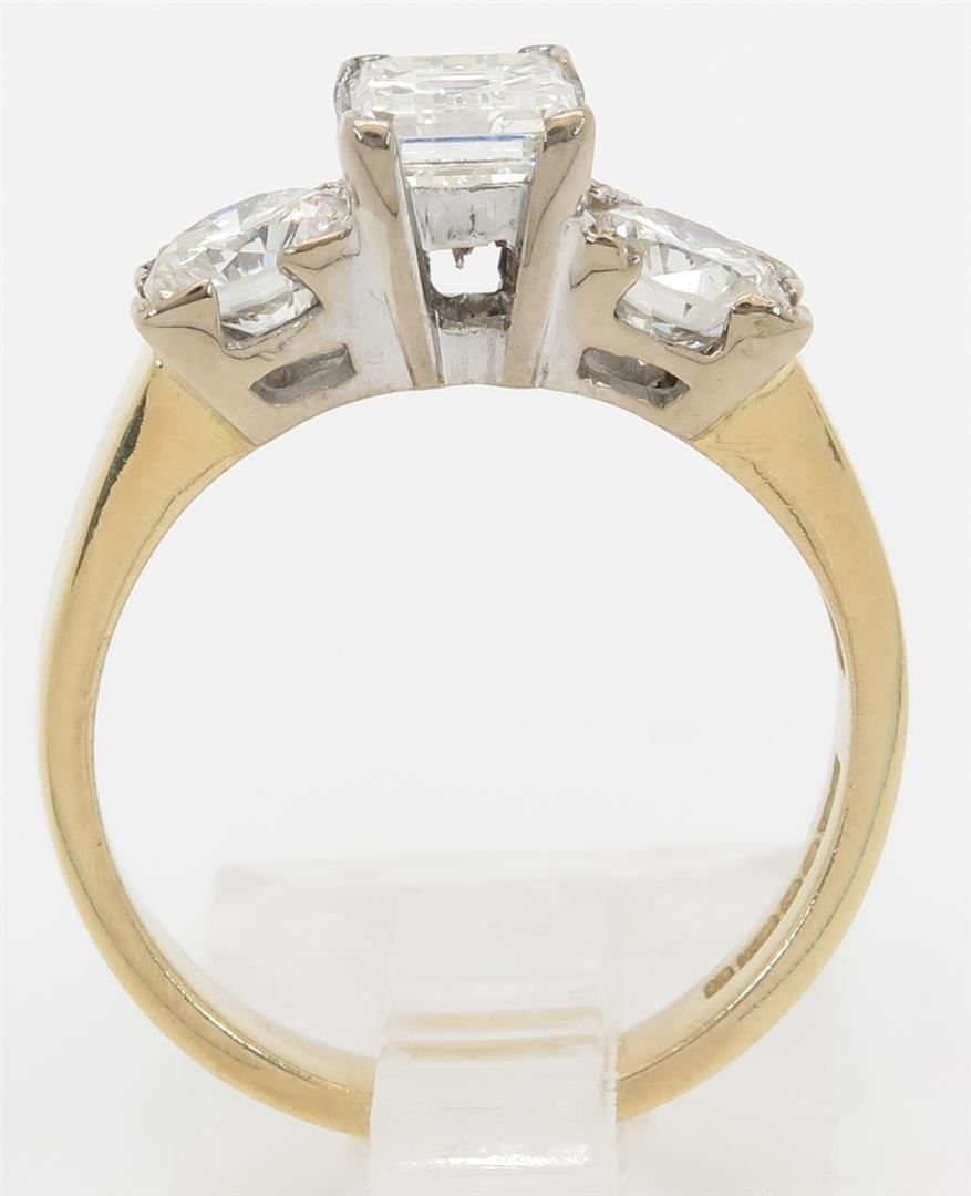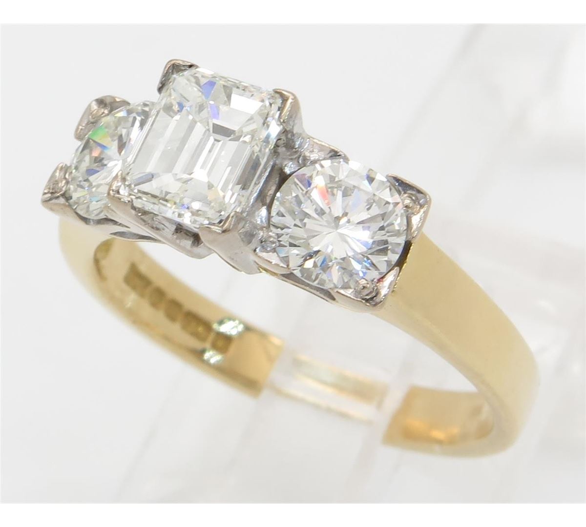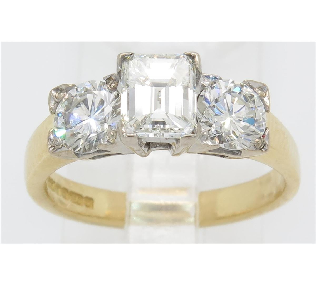 One tested 18K yellow gold diamond ring. Containing: One Emerald Cut Diamond, Size: .73CT, Clarity: VS2, Color: G-H. Two Round Brilliant Cut Diamonds, Approximate total diamond weight: 1.58CTW. All diamonds are graded in the mounting unless otherwise stated. Weight of ring: 4.0 grams, Size: 5.25.
