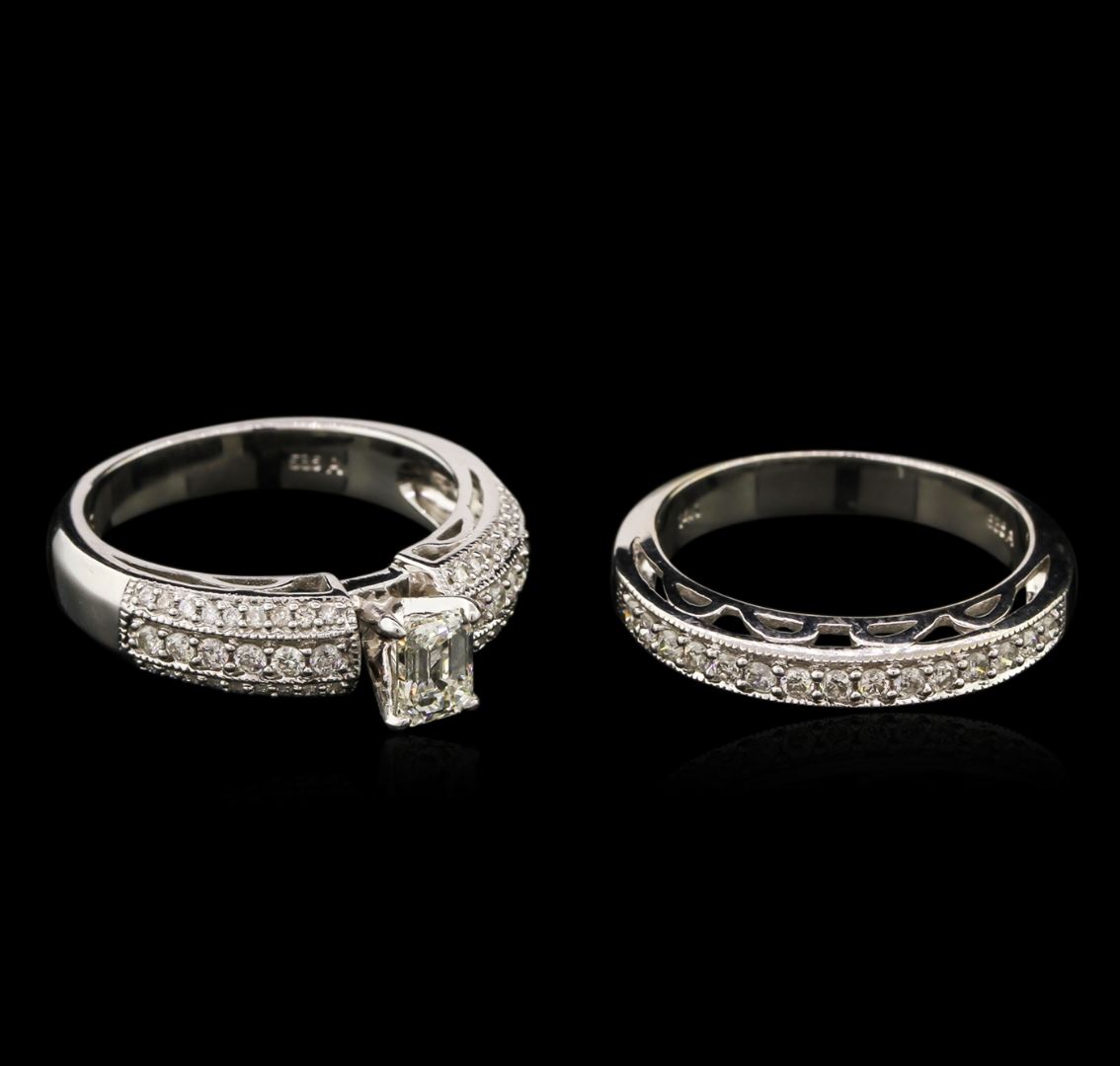One electronically tested 14KT white gold ladies cast diamond engagement ring & wedding band with a bright polish finish. Identified with markings of "14K". Condition is new. Containing: One prong set emerald cut diamond, measuring 5.30 x 3.90 x 2.61mm (depth est.) approximate weight of 0.53ct. Clarity: VS-2. Color: J, Cut is Good. Sixty-Three prong set round brilliant cut diamonds, measuring 1.60 - 1.30 x 0.87mm (depth est.) approximate total weight of 63 Stones = 1.05ct. Clarity: SI-1 to SI-2. Color: I - J, Cut is Good. Diamonds are graded in the mounting, unless otherwise stated. Total Weight of Diamonds 1.58ct. Total Weight of Engagement Ring & Wedding Band 8.20 grams. GGL Appraised at $4,765.00.