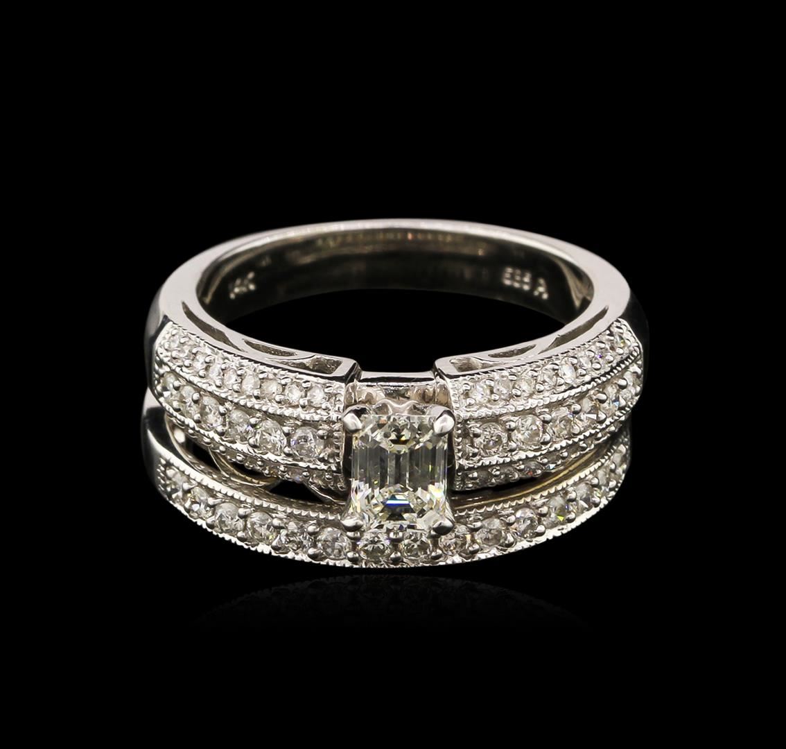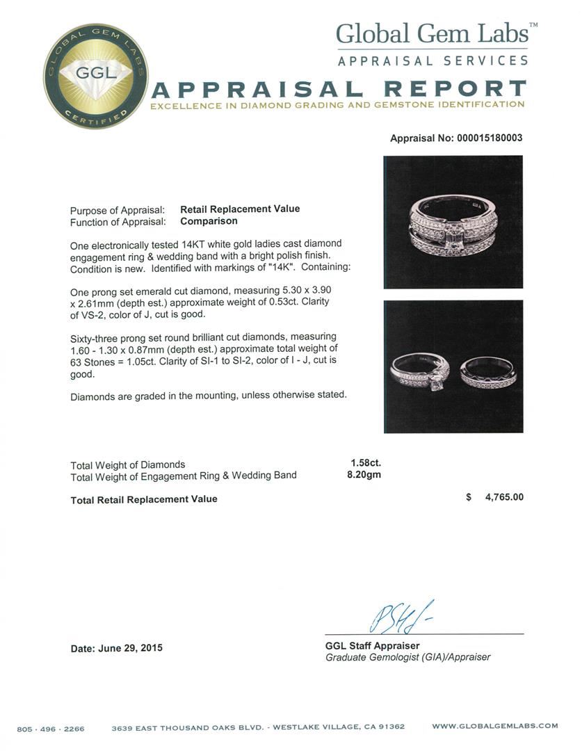 One electronically tested 14KT white gold ladies cast diamond engagement ring & wedding band with a bright polish finish. Identified with markings of "14K". Condition is new. Containing: One prong set emerald cut diamond, measuring 5.30 x 3.90 x 2.61mm (depth est.) approximate weight of 0.53ct. Clarity: VS-2. Color: J, Cut is Good. Sixty-Three prong set round brilliant cut diamonds, measuring 1.60 - 1.30 x 0.87mm (depth est.) approximate total weight of 63 Stones = 1.05ct. Clarity: SI-1 to SI-2. Color: I - J, Cut is Good. Diamonds are graded in the mounting, unless otherwise stated. Total Weight of Diamonds 1.58ct. Total Weight of Engagement Ring & Wedding Band 8.20 grams. GGL Appraised at $4,765.00.