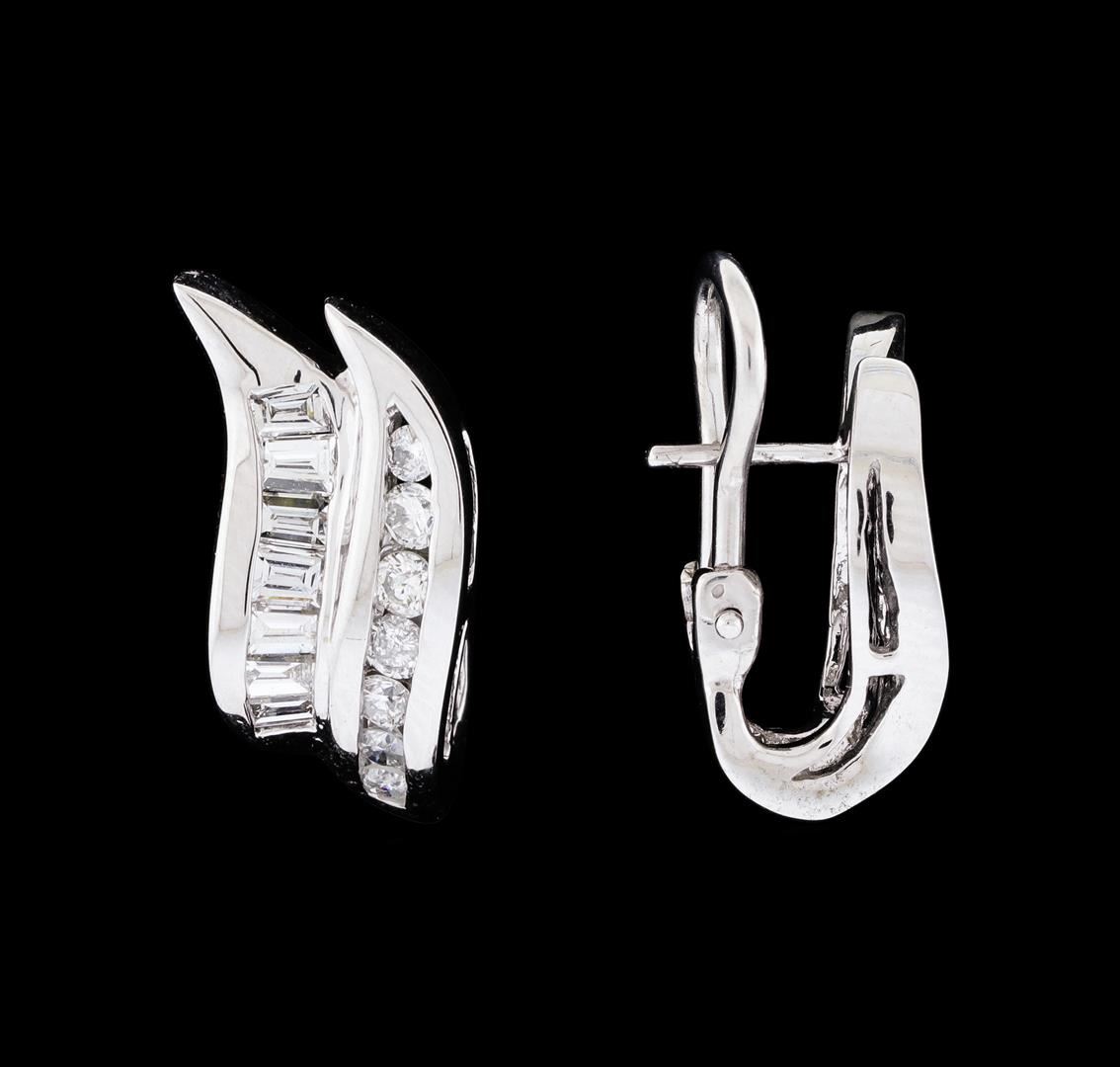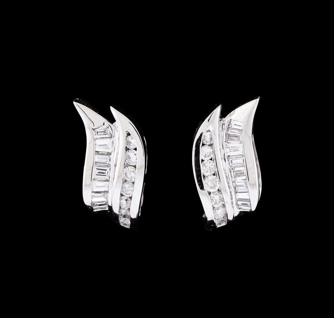 One pair electronically tested 14KT white gold lady's combination cast & assembled fashion 'J' style earrings with Omega clip backs with posts with a bright polish finish. Identified with markings of '14K'. Condition is new, good workmanship. Containing: Fourteen channel set round brilliant cut diamonds, measuring 2.50 - 2.30 x 1.49mm (depth est.) approximate total weight of 14 Stones = 0.74ct. Graded in the setting. Clarity SI-1 to SI-2. Color: H - I Cut Good Fourteen channel set baguette cut diamonds, measuring from 2.20 x 1.50 x 1.28mm (depth est.) to 2.80 x 2.00 x 1.70mm (depth est.) approximate total weight of 14 Stones = 0.85ct. Graded in the setting. Clarity VS-1 to VS-2. Color: H - I Cut Very Good. Total Weight of Diamonds 1.59ct.. Total Weight of Earrings 6.70gm. GAS Appraised at $4,420.00.