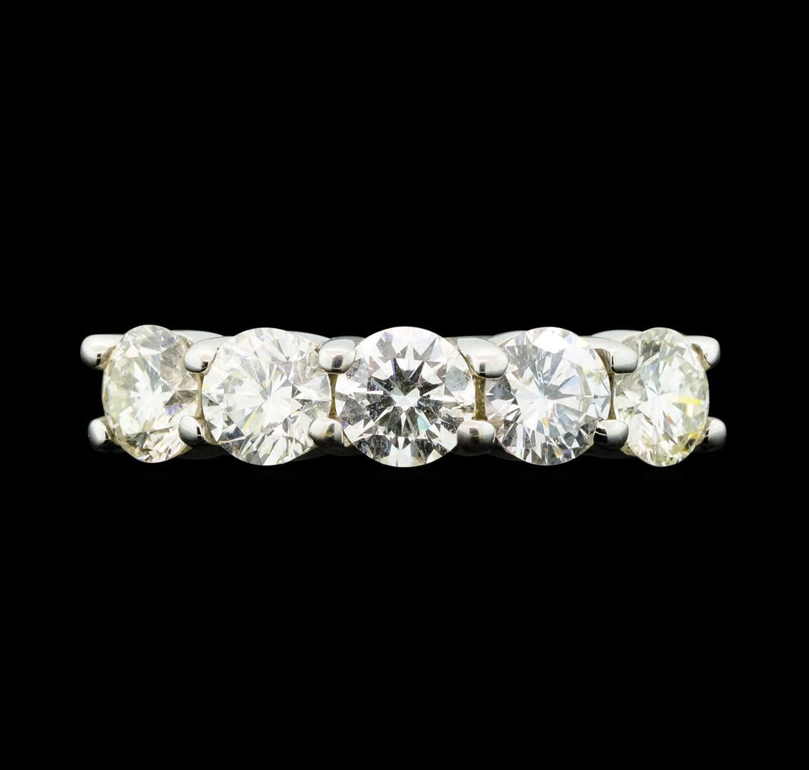 One electronically tested 14KT white gold lady's cast wedding ring with a straight line five stone motif with a bright polish finish. The featured lady's ring has a shank measuring 3.23 millimeters wide. Identified with markings of '14K'. Condition is new, good workmanship. Containing: Five prong set round brilliant cut diamonds, measuring 4.50 - 4.40 x 2.67mm (depth est.) approximate total weight of 5 Stones = 1.59ct. Graded in the setting. Clarity SI-2 to I-1. Color: I - J Cut Good. Total Weight of Diamonds 1.59ct.. Total Weight of Ring 4.10gm GAS Appraised at $5,850.00.