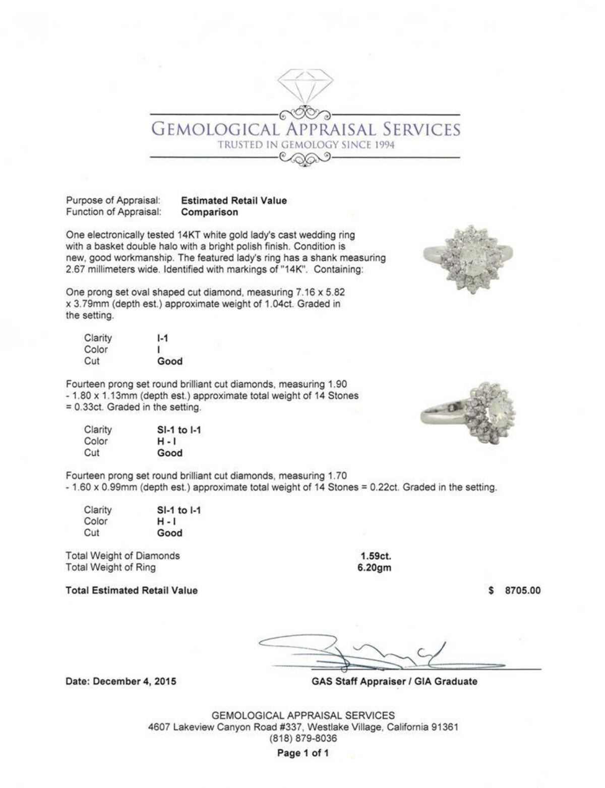 One electronically tested 14KT white gold lady's cast wedding ring with a basket double halo with a bright polish finish. The featured lady's ring has a shank measuring 2.67 millimeters wide. Identified with markings of "14K". Condition is new, good workmanship. Containing: One prong set oval shaped cut diamond, measuring 7.16 x 5.82 x 3.79mm (depth est.) approximate weight of 1.04ct. Graded in the setting. Clarity: I-1. Color: I. Cut Good Fourteen prong set round brilliant cut diamonds, measuring 1.90 - 1.80 x 1.13mm (depth est.) approximate total weight of 14 Stones = 0.33ct. Graded in the setting. Clarity: SI-1 to I-1. Color: H - I. Cut Good Fourteen prong set round brilliant cut diamonds, measuring 1.70 - 1.60 x 0.99mm (depth est.) approximate total weight of 14 Stones = 0.22ct. Graded in the setting. Clarity: SI-1 to I-1. Color: H - I. Cut Good. Total Weight of Diamonds 1.59ct. Total Weight of Ring 6.20gm. GAS Appraised.