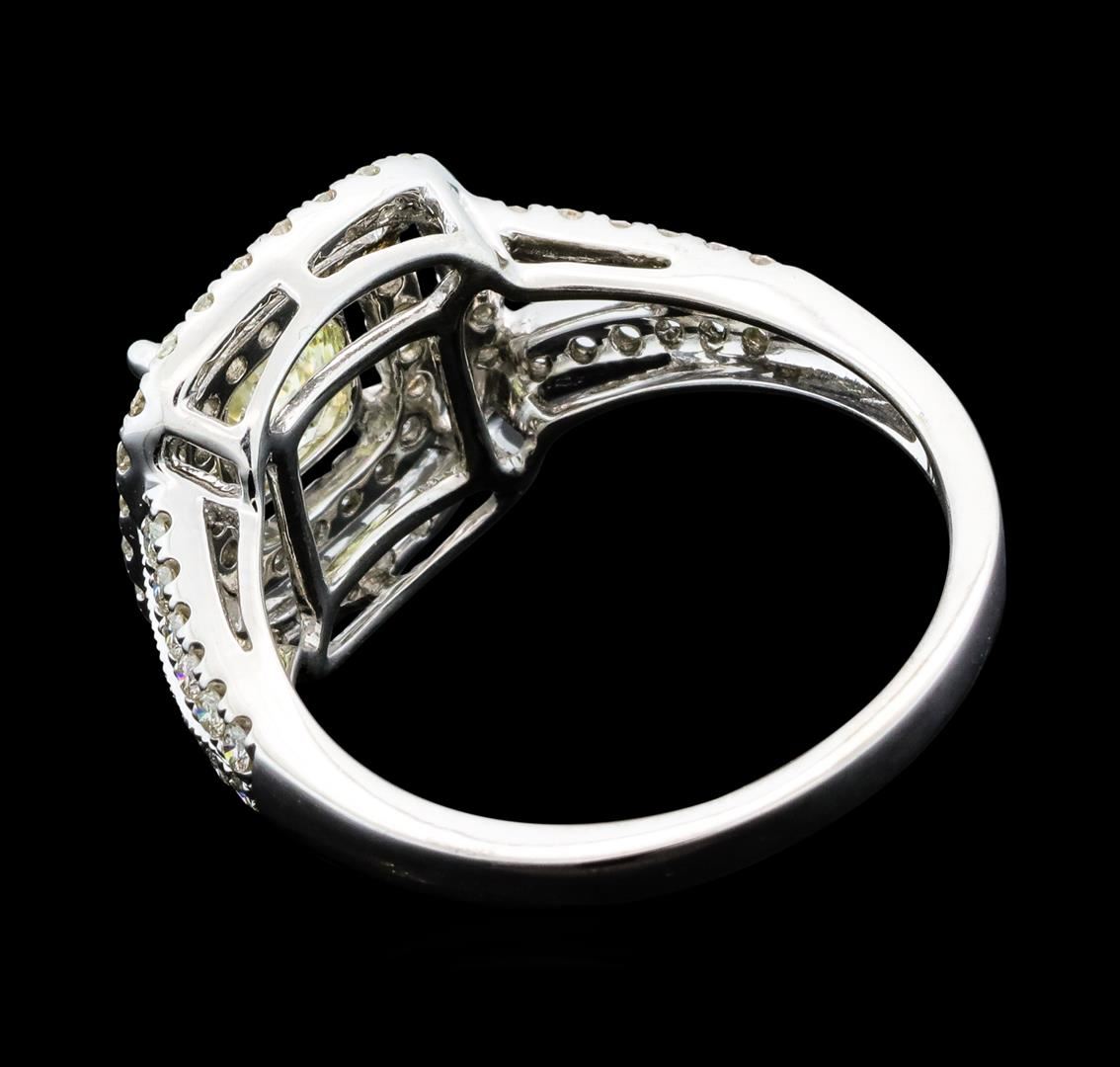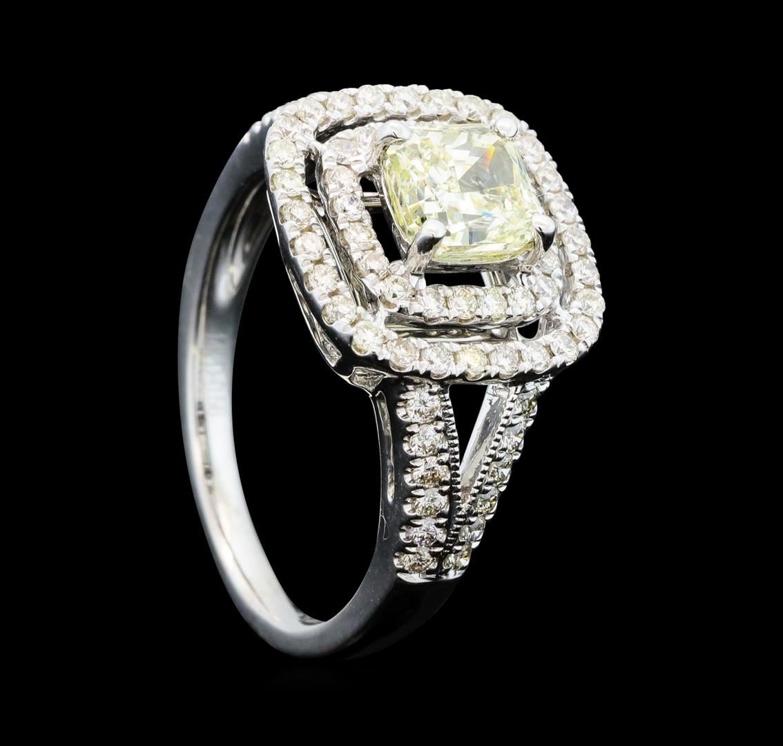 One electronically tested 14KT white gold lady's cast wedding ring with a split shank double halo with a bright polish with milgrain detailing finish. The featured lady's ring has a shank measuring 1.82 millimeters wide. Identified with markings of '14K'. Condition is new, good workmanship. Containing: One prong set cushion cut diamond, measuring 5.47 x 5.38 x 3.75mm (depth est.) , 10.00.%. GTCF approximate weight of 1.03ct. Graded in the setting. Clarity SI-3. Color: L - M Cut Very Good Seventy-Two prong set round brilliant cut diamonds, measuring 1.30 - 1.25 x 0.79mm (depth est.) approximate total weight of 72 Stones = 0.56ct. Graded in the setting. Clarity SI-1 to SI-2. Color: H - I Cut Very Good. Total Weight of Diamonds 1.59ct.. Total Weight of Ring 3.80gm. GAS Appraised.