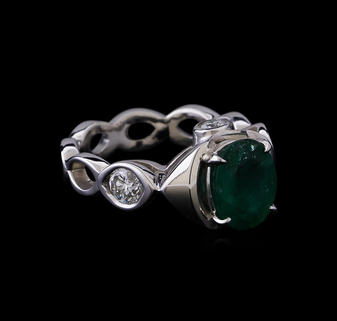 One 14K white gold lady's ring. 7.62 gr. Containing: 1 - one center oval cut natural emerald. 1.59 CTS TW. 2 - 0.33 CTS TW round cut diamonds. All SI clarity, G-H color. Fine Cutting and proportions.