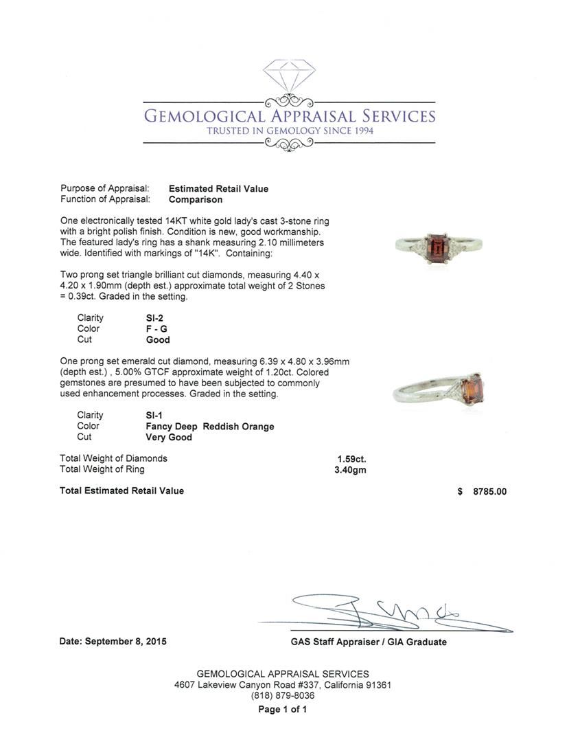One electronically tested 14KT white gold lady's cast 3-stone ring with a bright polish finish. The featured lady's ring has a shank measuring 2.10 millimeters wide. Identified with markings of "14K". Condition is new, good workmanship. Containing: Two prong set triangle brilliant cut diamonds, measuring 4.40 x 4.20 x 1.90mm (depth est.) approximate total weight of 2 Stones = 0.39ct. Graded in the setting. Clarity: SI-2. Color: F - Good One prong set emerald cut diamond, measuring 6.39 x 4.80 x 3.96mm (depth est.) , 5.00.%. GTCF approximate weight of 1.20ct. Colored gemstones are presumed to have been subjected to commonly used enhancement processes. Graded in the setting. Clarity: SI-1 Cut Very Good. Total Weight of Diamonds 1.59ct. Total Weight of Ring 3.40gm. GAS Appraised at $8,785.00.