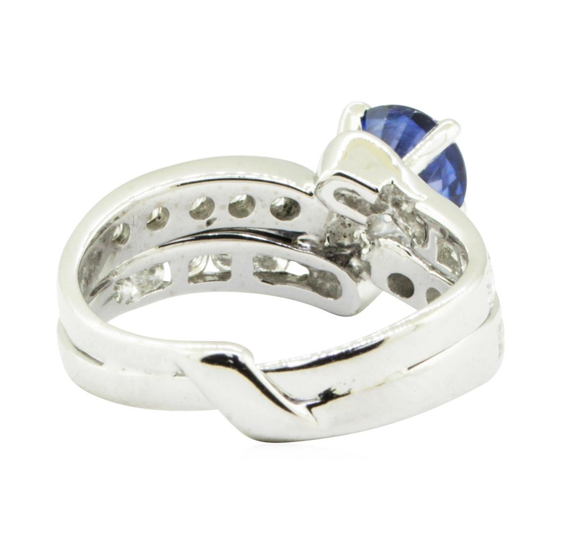One electronically tested 14KT white gold lady's combination cast & assembled fashion double band ring with a bypass motif with a bright polish finish. The featured lady's ring has a crossover double shank measuring 3.90 millimeters in width. Identified with markings of '14K'. Condition is like new, good workmanship. Containing: One prong set round modified brilliant cut natural blue sapphire, measuring 6.40 - 6.35 x 3.57 mm, (depth est.) approximate weight of 1.21ct., clarity is eye clean, medium, strong, violetish blue color, (GIA vB 5/5), cut is very good. Transmitting light with no distortion, transparent. Colored gemstones are presumed to have been subjected to commonly used enhancement processes. Graded in the setting. Twenty channel set round brilliant cut diamonds, measuring 1.90 - 1.85 x 1.13mm (depth est.) approximate total weight of 20 Stones = 0.38ct. Graded in the setting. Color G - H Clarity VS-2 to SI-1 Cut Very Good. Total Weight of Colored Stones 1.21ct.. Total Weight of Diamonds 0.38ct.. Total Weight of Ring 4.90gm GAS Appraised at $3450.00. GAS Appraised.