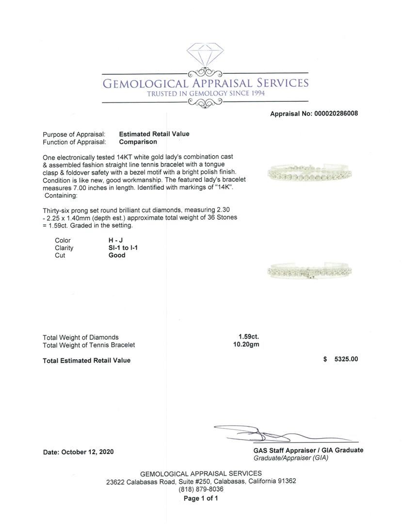One electronically tested 14KT white gold lady's combination cast & assembled fashion straight line tennis bracelet with a tongue clasp & foldover safety with a bezel motif with a bright polish finish. The featured lady's bracelet measures 7.00 inches in GAS Appraised.