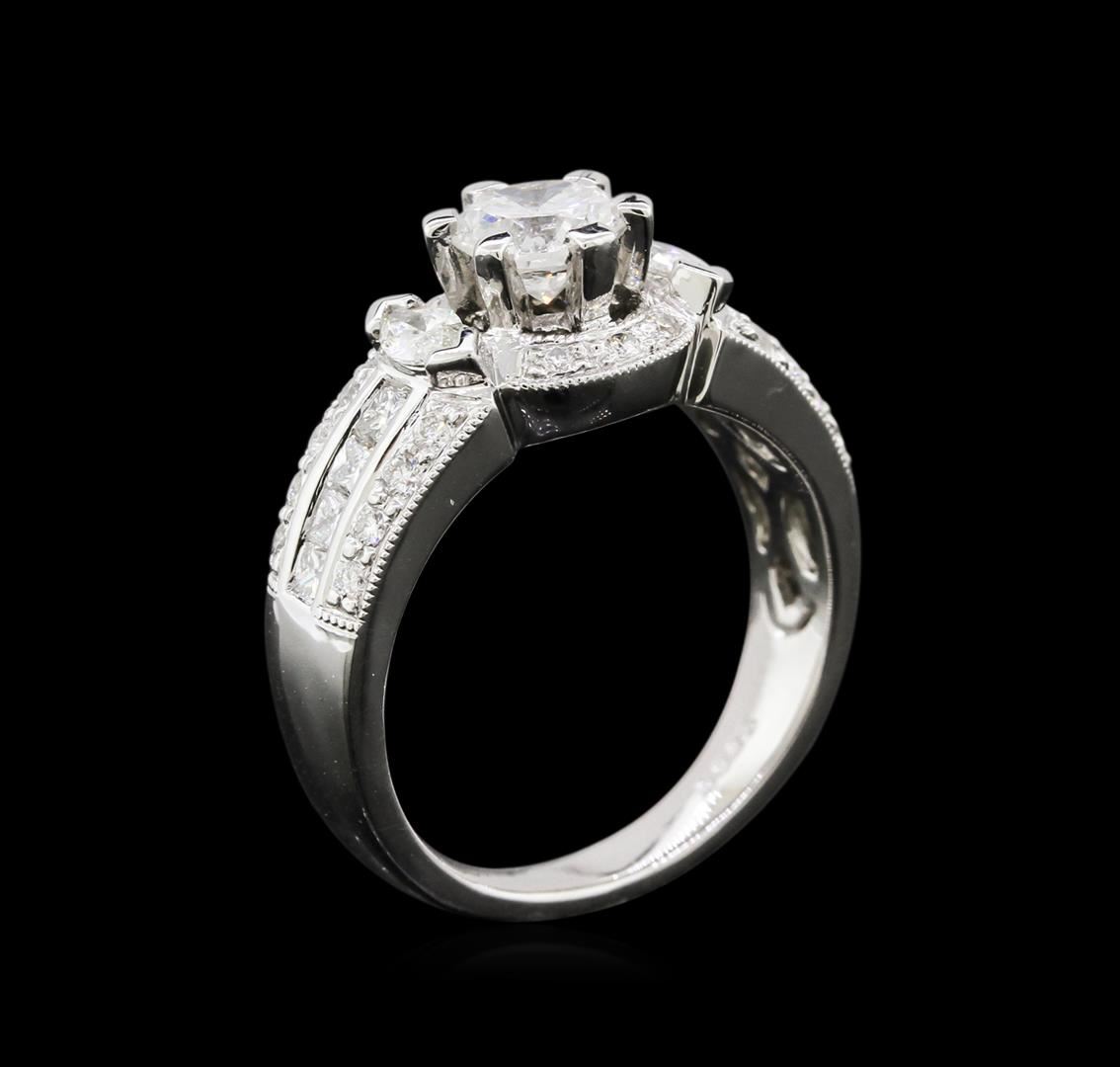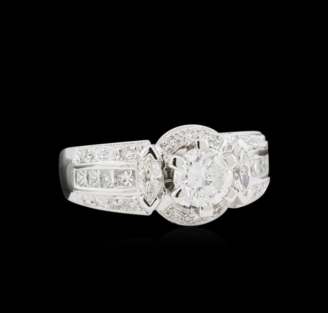 One electronically tested 14KT white gold ladies cast diamond unity ring. The featured diamond is set within a diamond bezel supported by a diamond set shoulders, completed by a two and one-half millimeter wide band. Bright polish finish with milgrain detailing. Identified with markings of "14K". Condition is new, good workmanship. Containing: One prong set round brilliant cut diamond, measuring 5.79 - 5.75 x 3.50mm (depth est.) approximate weight of 0.74ct. Graded in the setting. Clarity: I-1. Color: 60.7%. Table 65.9%. Two prong set marquise shaped cut diamonds, measuring 5.00 x 2.40 x 1.51mm (depth est.) approximate total weight of 2 Stones = 0.21ct. Graded in the setting. Clarity: I-1. Color: I Eight channel set princess cut diamonds, measuring 2.20 x 2.00 x 1.50mm (depth est.) approximate total weight of 8 Stones = 0.43ct. Graded in the setting. Clarity: SI-2 to I-1. Color: G - I Twenty-Two prong set round brilliant cut diamonds, measuring 1.40 - 1.20 x 0.78mm (depth est.) approximate total weight of 22 Stones = 0.21ct. Graded in the setting. Clarity: SI-1 to I-1. Color: G - I. Total Weight of Diamonds 1.59ct. Total Weight of Ring 7.08gm. AIG Appraised at $8,475.00.