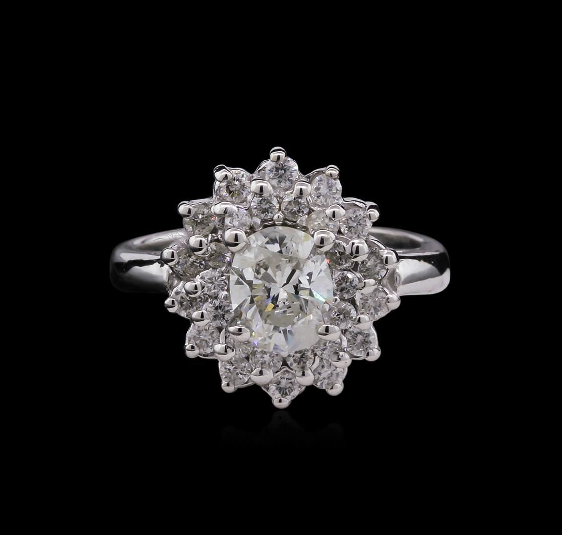 One electronically tested 14KT white gold lady's cast wedding ring with a basket double halo with a bright polish finish. The featured lady's ring has a shank measuring 2.67 millimeters wide. Identified with markings of "14K". Condition is new, good workmanship. Containing: One prong set oval shaped cut diamond, measuring 7.16 x 5.82 x 3.79mm (depth est.) approximate weight of 1.04ct. Graded in the setting. Clarity: I-1. Color: I. Cut Good Fourteen prong set round brilliant cut diamonds, measuring 1.90 - 1.80 x 1.13mm (depth est.) approximate total weight of 14 Stones = 0.33ct. Graded in the setting. Clarity: SI-1 to I-1. Color: H - I. Cut Good Fourteen prong set round brilliant cut diamonds, measuring 1.70 - 1.60 x 0.99mm (depth est.) approximate total weight of 14 Stones = 0.22ct. Graded in the setting. Clarity: SI-1 to I-1. Color: H - I. Cut Good. Total Weight of Diamonds 1.59ct. Total Weight of Ring 6.20gm. GAS Appraised.