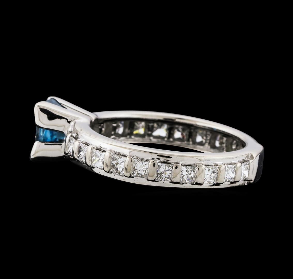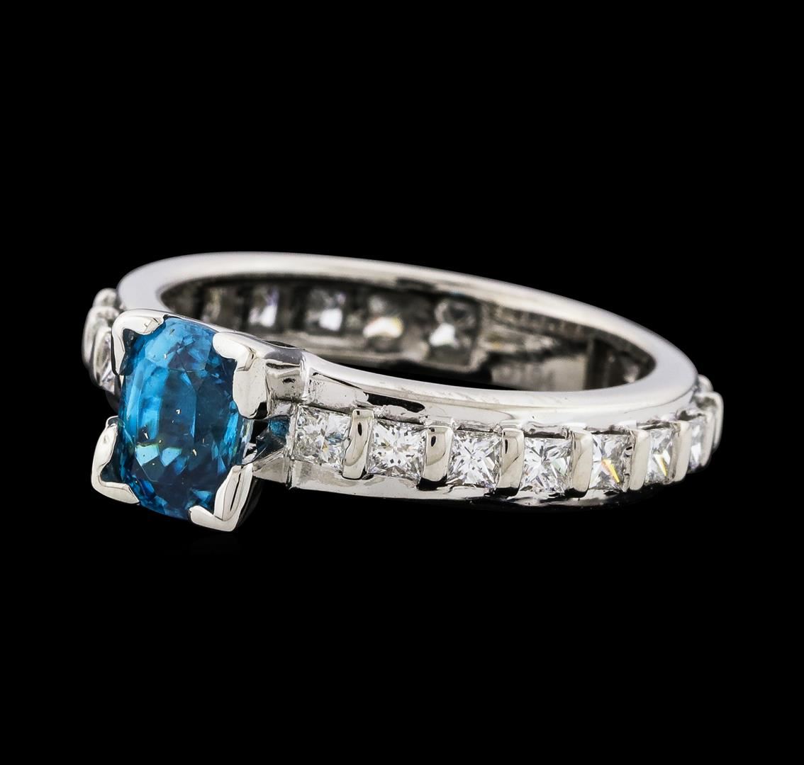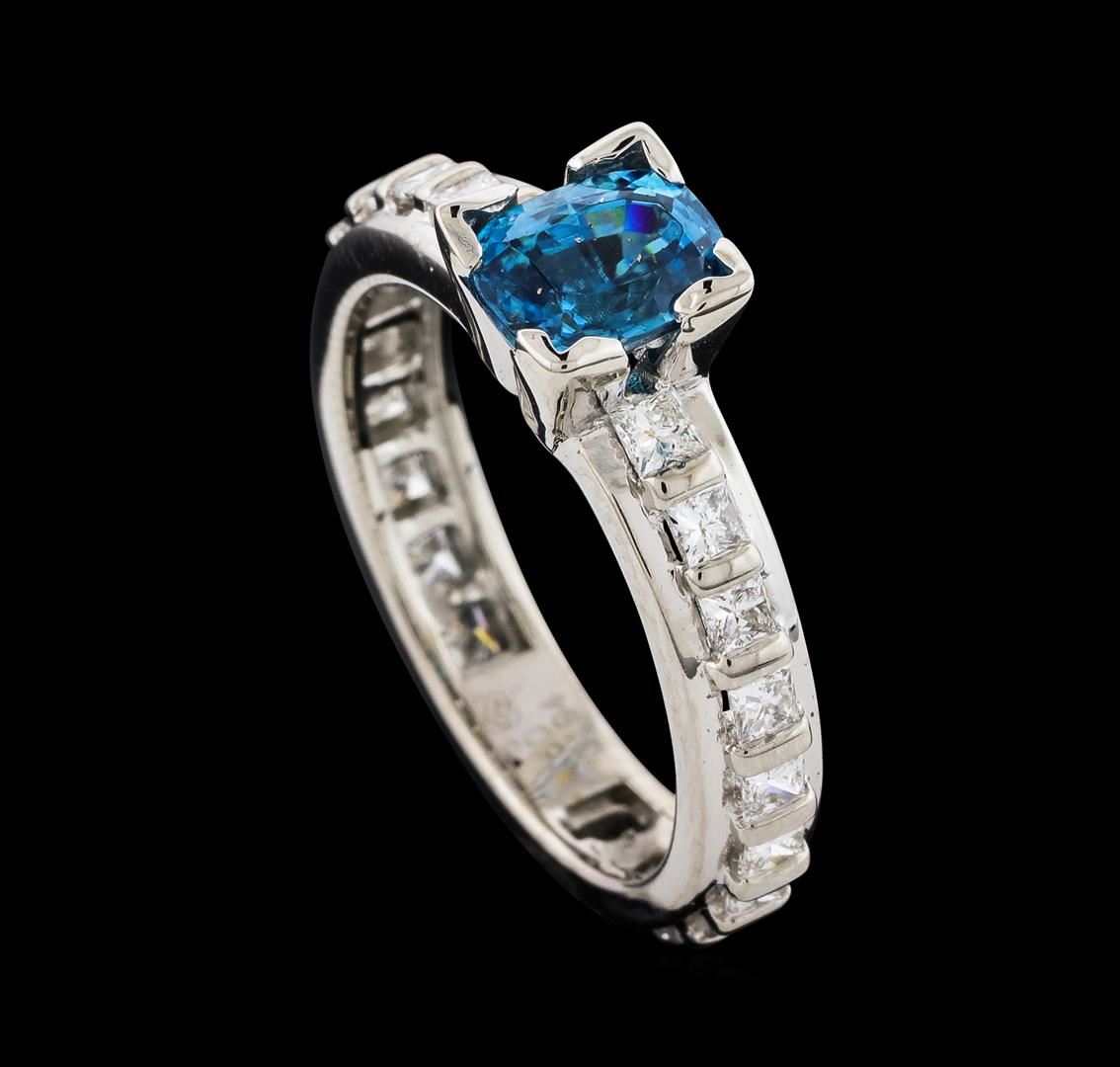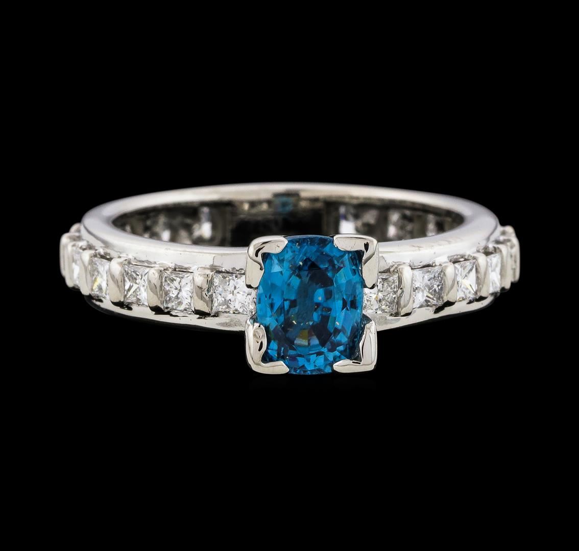 One Blue Zircon and Diamond Ring featuring: 18KT White Gold with a total weight of 5.55 grams, Blue Zircon with a total weight of 1.60ct, and side diamonds with a total weight of 0.60ctw.