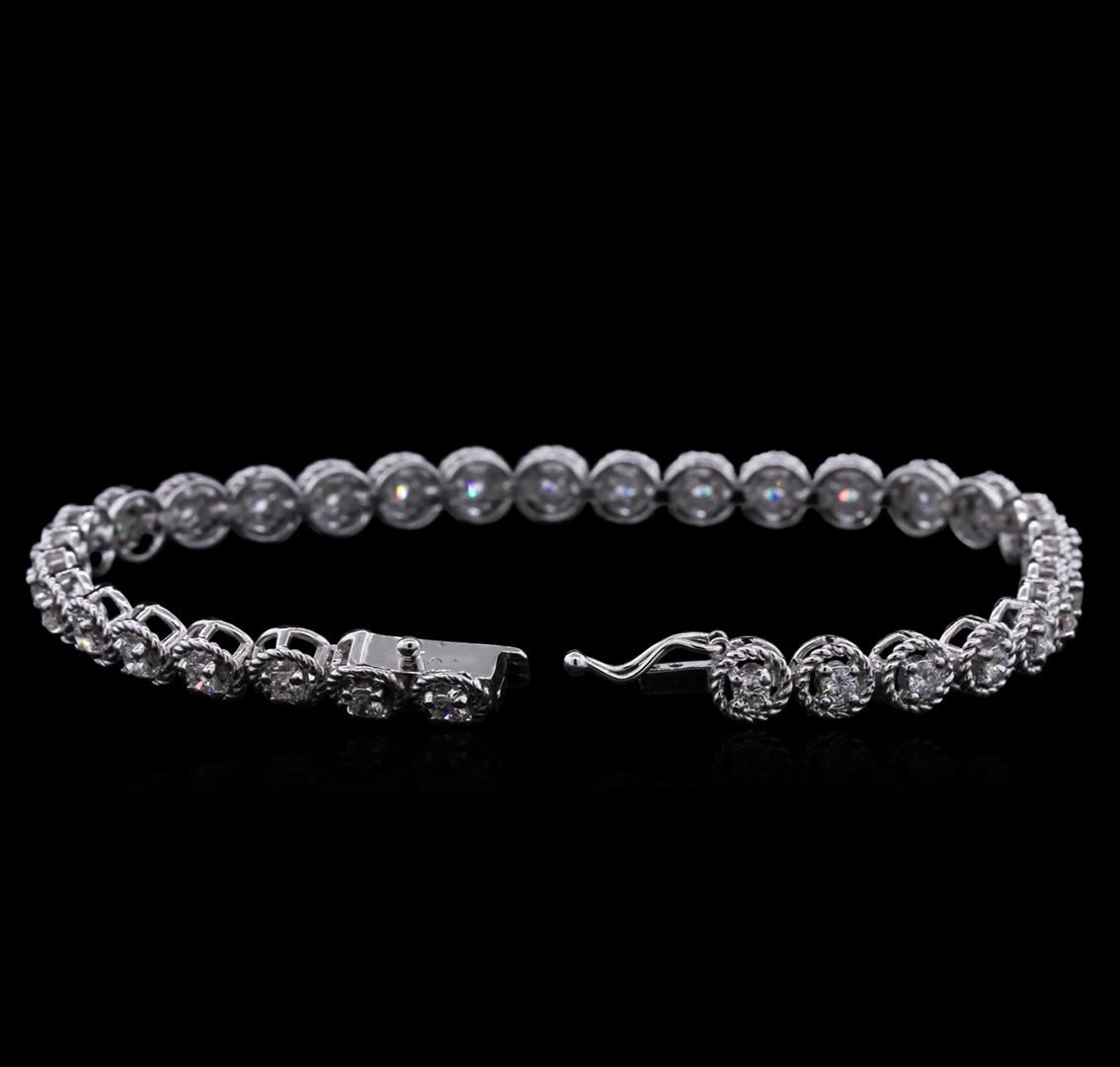 One electronically tested 14KT white gold lady's combination cast & assembled straight line bracelet with a tongue clasp with foldover safety with a bright polish finish. The featured lady's bracelet measures 7 inches in length. Identified with markings of "K14". Condition is new, good workmanship. Containing: Thirty-Three prong set round brilliant cut diamonds, measuring 2.40 - 2.30 x 1.43mm (depth est.) approximate total weight of 33 Stones = 1.60ct. Graded in the setting. Clarity: SI-1 to SI-2 . Color: H - I. Cut Very Good. Total Weight of Diamonds 1.60ct.. Total Weight of Bracelet 12.10gm at $ 5960.00 GAS Appraised.