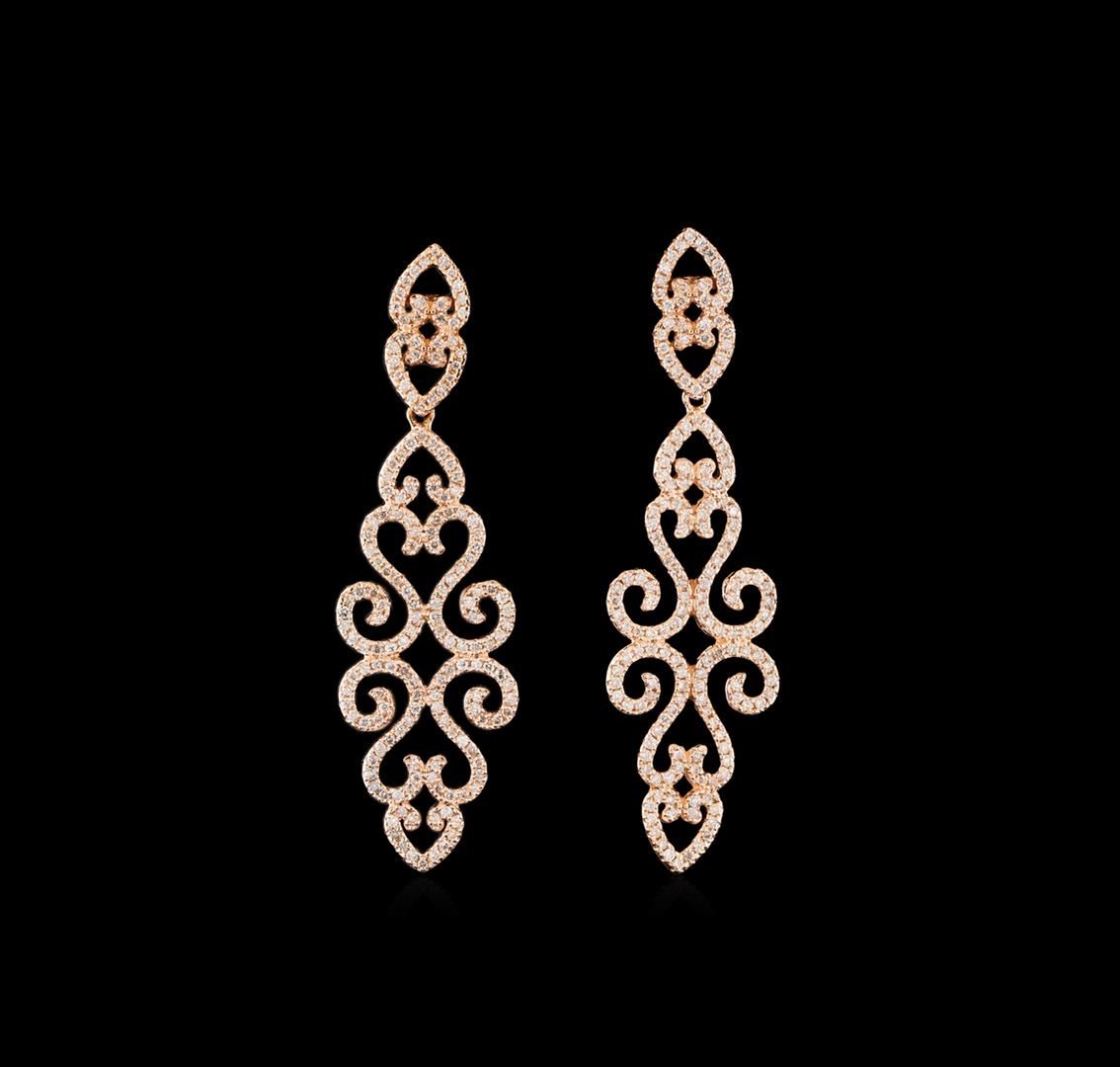 One pair electronically tested 14KT rose gold lady's cast dangle earrings with friction posts with a bright polish finish. The featured pair of lady's earrings have a drop of 53 millimeters. Identified with markings of '585'. Condition is new, good workmanship. Containing: Three Hundred Thirty-Six prong set round brilliant cut diamonds, measuring 1.15 - 1.05 x 0.66mm (depth est.) approximate total weight of 336 Stones = 1.60ct. Graded in the setting. Clarity SI-1 to I-1. Color: G - I Cut Good. Total Weight of Diamonds 1.60ct.. Total Weight of Earrings 9.90gm. GAS Appraised at $8,335.00.